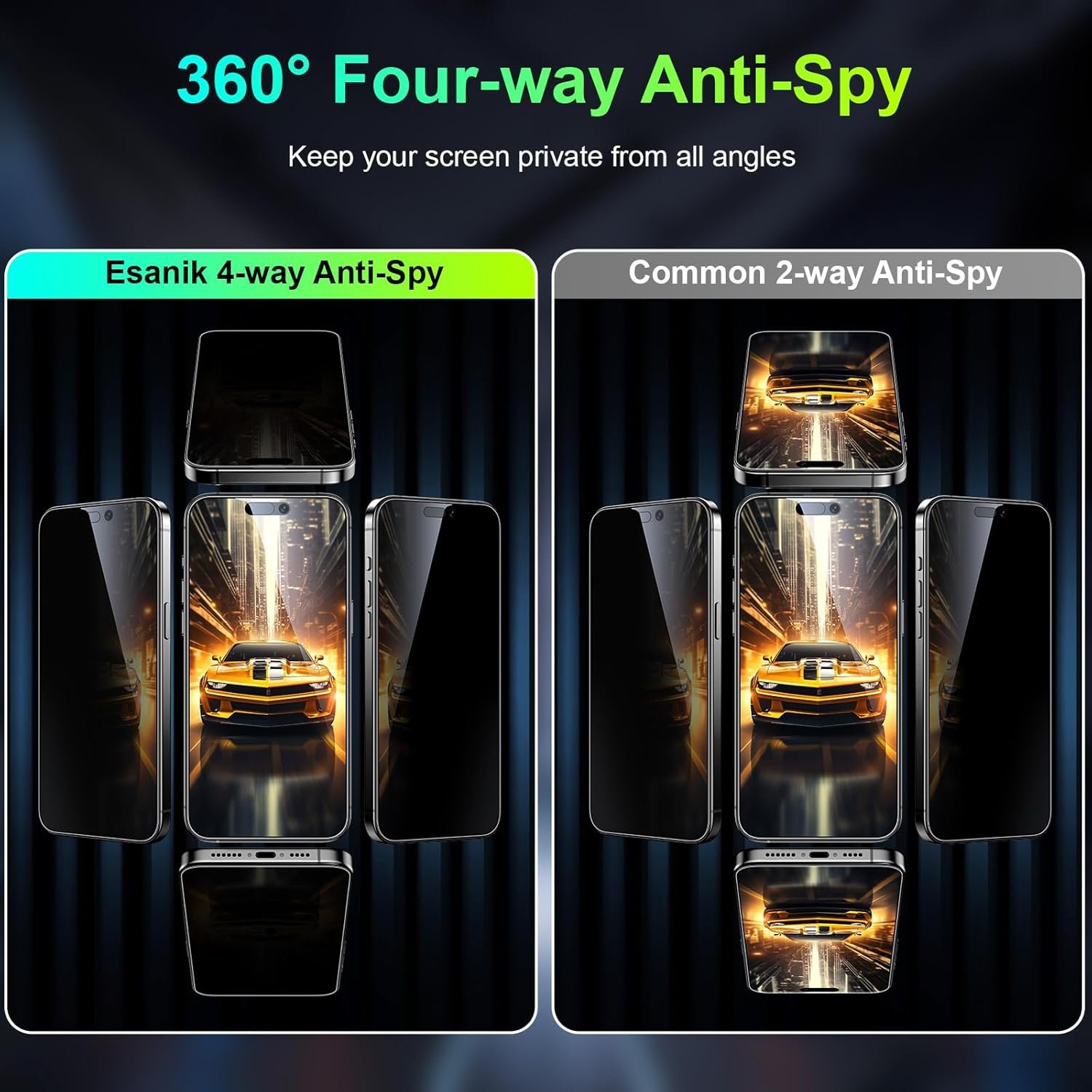 [360-degree Privacy Protection] Esanik 4-way Anti-spy Screen Protector for iPhone 15 Pro Max will ensures complete privacy from ALL angles, preventing side-angle viewing of the screen.Safeguard your sensitive information and maintain confidentiality in public spaces.
