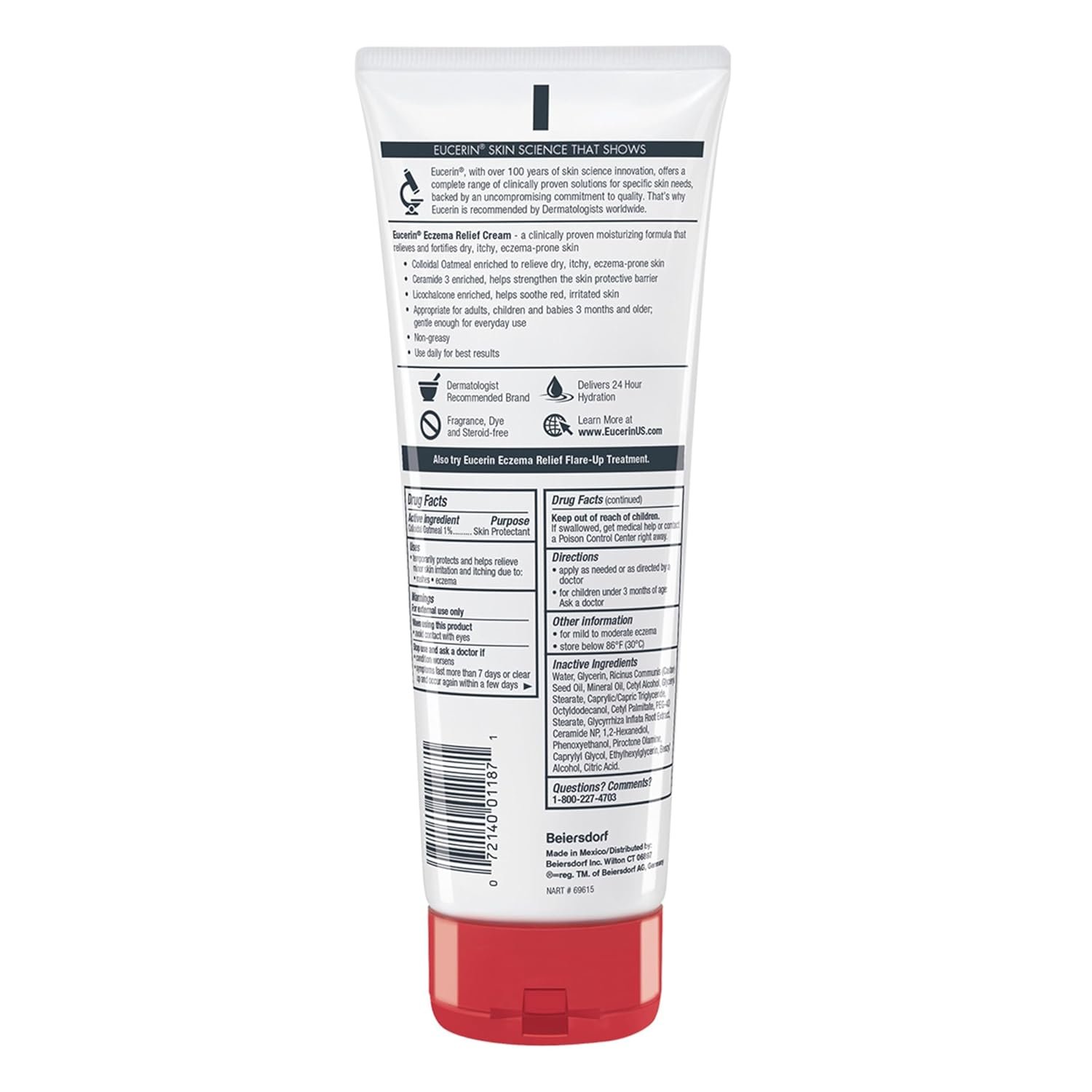 Eucerin Eczema Relief Body Cream is a clinically proven moisturizing formula that relieves and fortifies dry, itchy, eczema-prone skin. This fast-absorbing skin cream for eczema is formulated with colloidal oatmeal (a skin protectant), Ceramide-3 to lock in moisture, and Licorice Root Extract to help soothe irritated skin. This eczema cream is fragrance free and steroid free, and delivers 24 hour hydration. Eucerin Eczema Relief Body Cream is gentle enough for everyday use, and is appropriate for use on adults, children and babies 3 months and older. In a clinical study, with daily use, 4 out of 5 children remained flare-free for 6 months*. For Eczema flare-ups, use Eucerin Eczema Relief Flare-Up Treatment Cream. Eucerin is a dermatologist-recommended skin care brand that is based on an uncompromising approach to science. With skin care products designed to restore and sustain healthy-looking skin, families everywhere look to Eucerin to enhance outer beauty and self-confidence. *J Drugs Dermatol Children’s Clinical (2015);14478-479 **Based on Beiersdorf’s assessment of OmniMarket Service data reported by Circana, LLC of Total US Multi-Outlet on the Hand & Body Lotion Category, categorized for eczema, for the 52-week period ending 2-25-2024