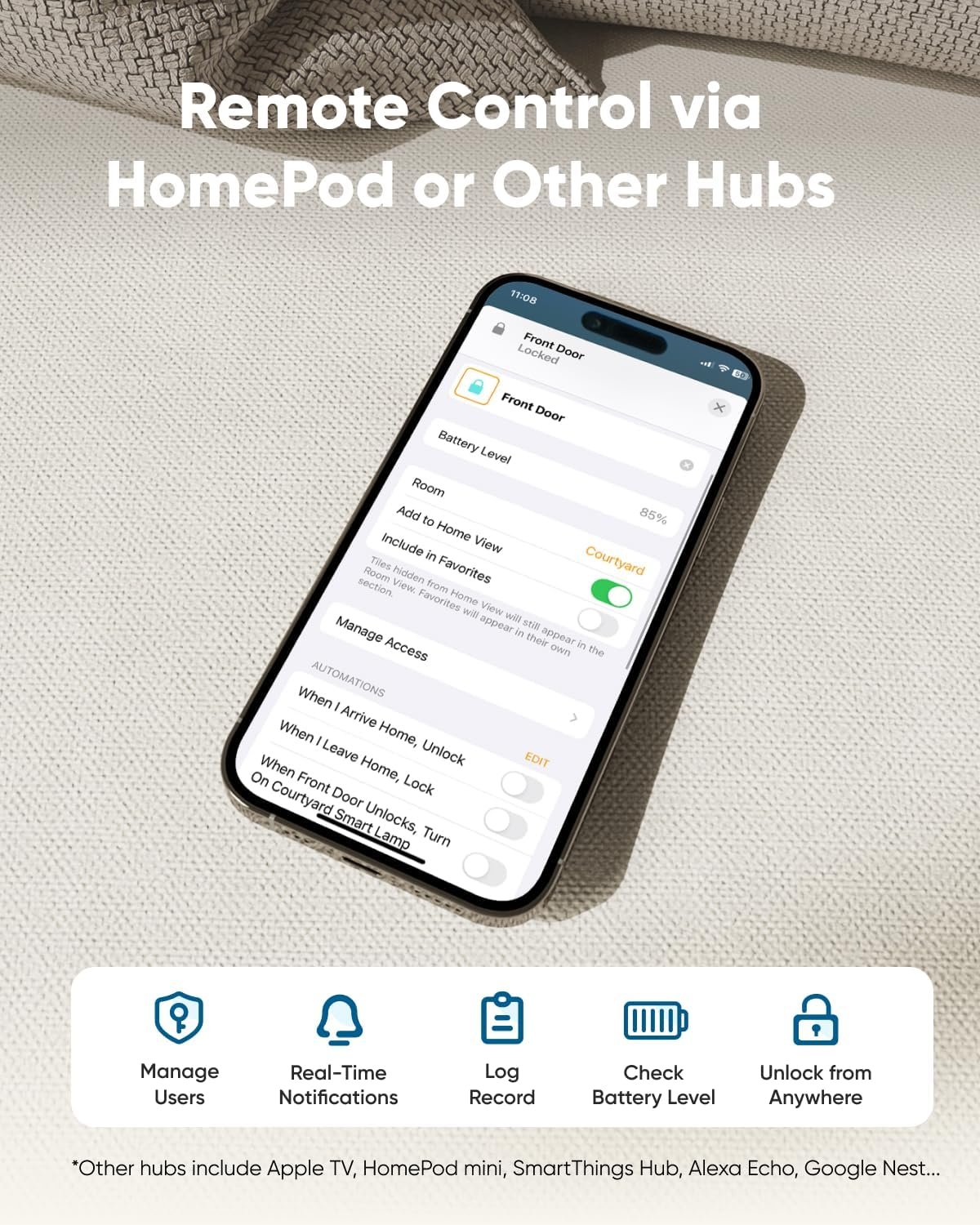 Remote Control via Homepod or Other Hubs: Easily control your Smart Lock remotely with Apple Home or other apps. Features include simple setup, access management, real-time notifications, event logs, and remote unlocking. Note:For more details, please refer to the Q&A and Rich Context sections.