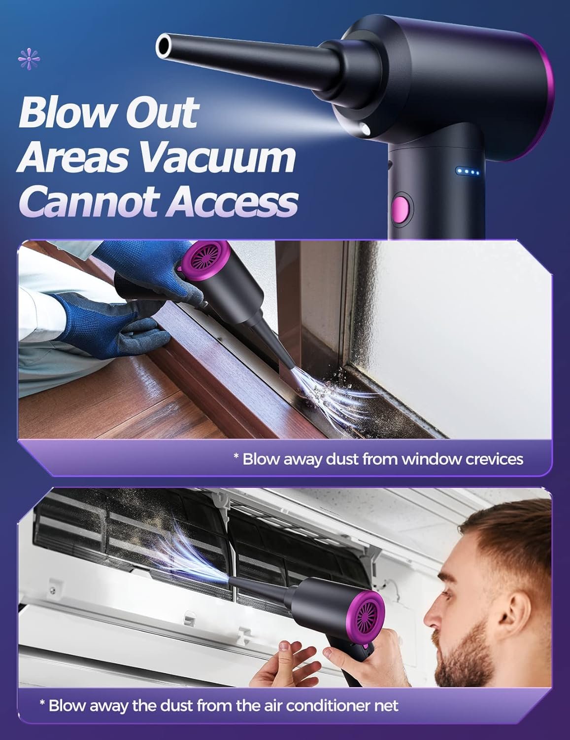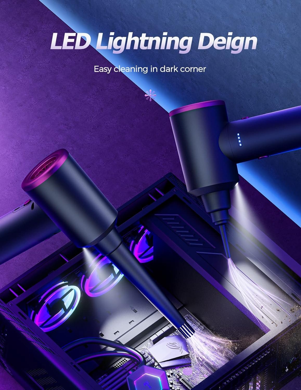 LED Lighting – The air duster is designed with an LED light, which will automatically light up when you turn on the electric air duster. It allows you to easily clean the dark corners and brings great convenience to your cleaning work.