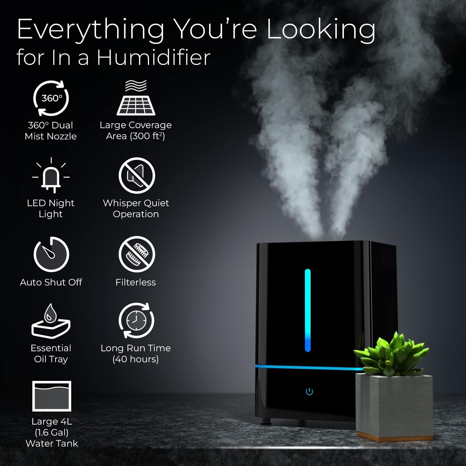 Everlasting Comfort: Cool Mist Humidifier for Bedroom 4L – Large Room, Filterless Humidifier with Essential Oil Diffuser, Easy Clean & Quiet, Black