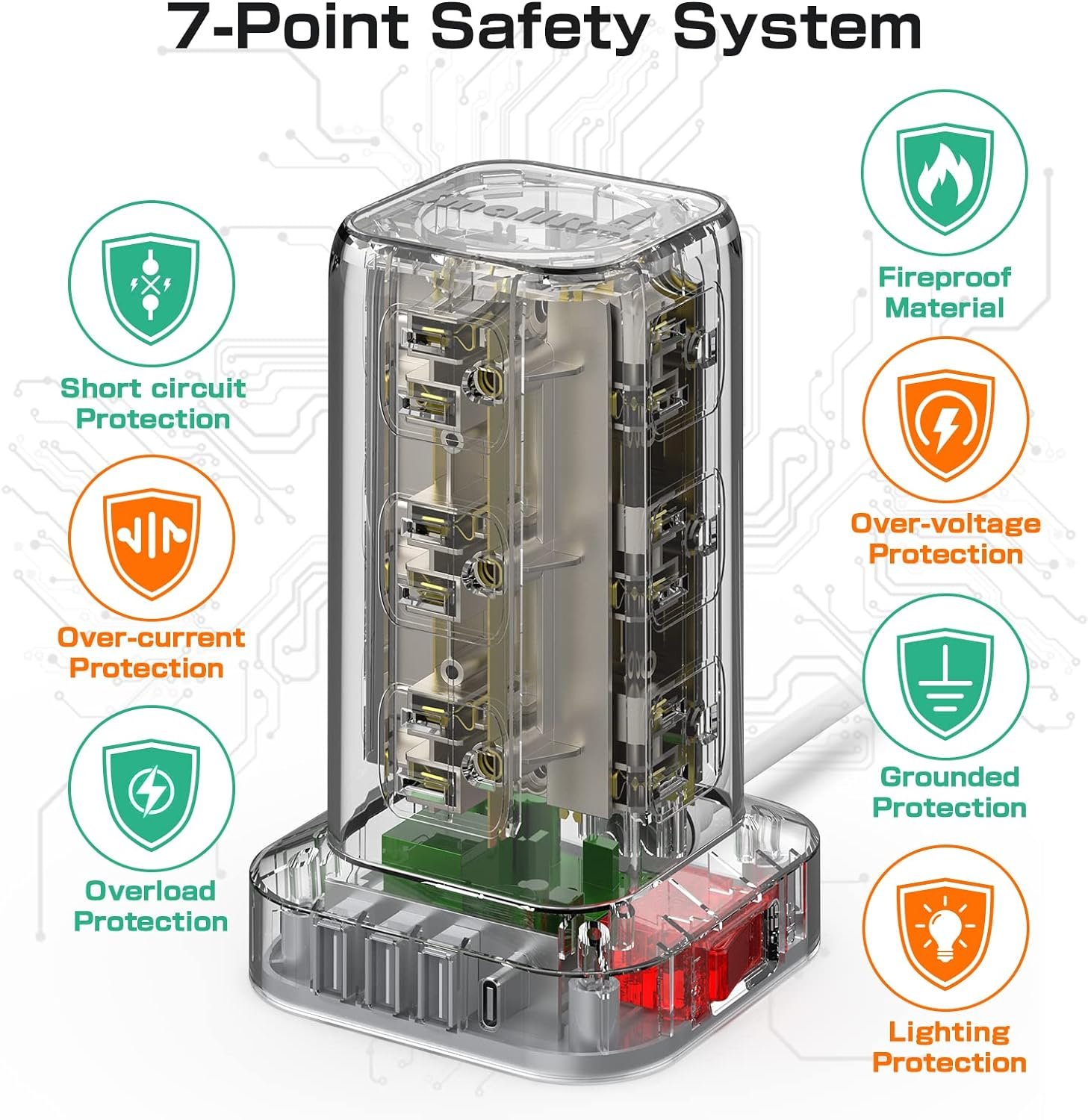 【Safe and Ease of use 】The 6.5FT upgraded extension cord with multiple outlets is made of pure copper. Reinforced design at the junction of the stand of power strip tower and the wire head. To protect the terminal from wear and tear. Environmental protection and fire-resistance PC shell with flame retardant at 1382℉ makes it more safe and longer lifetime.