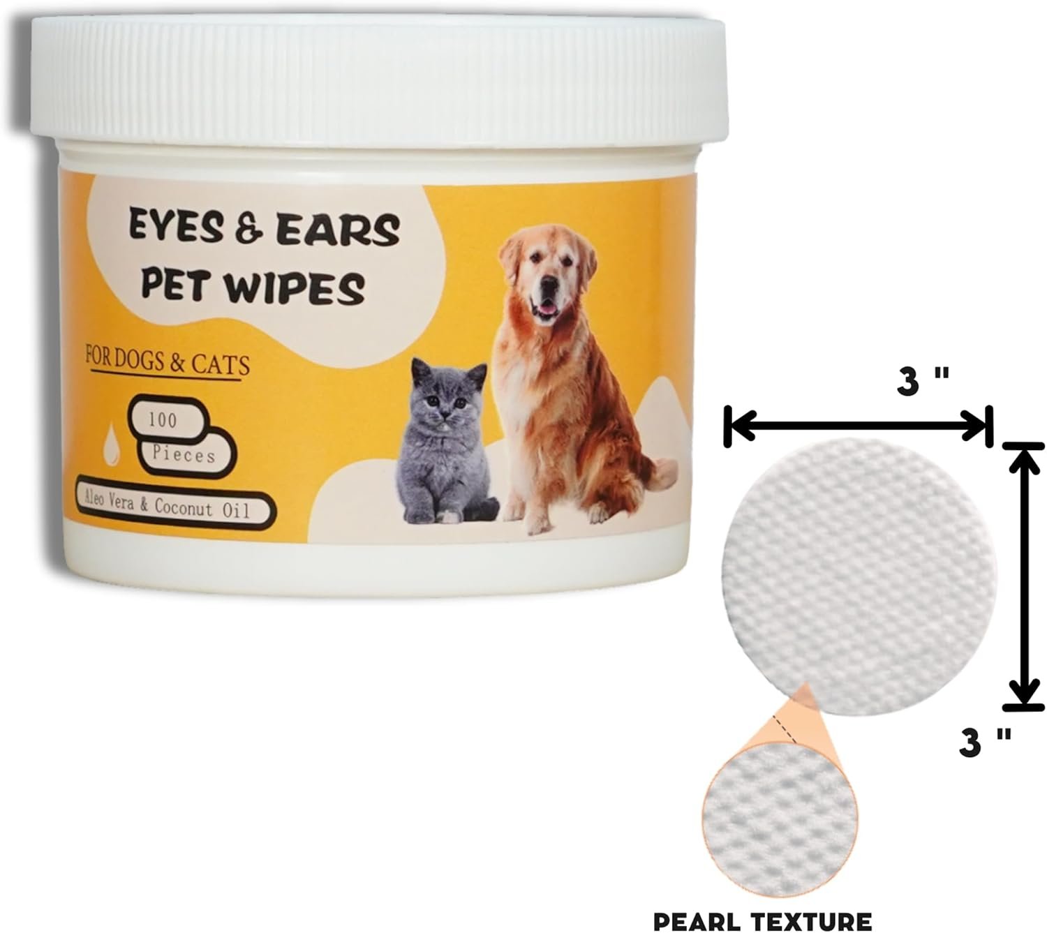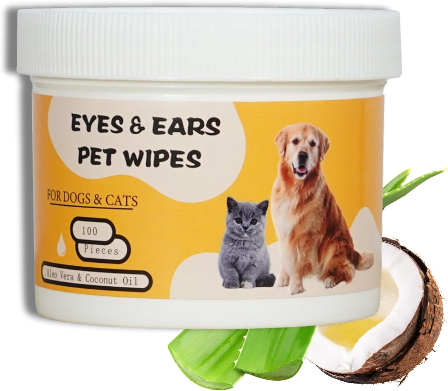 Eye & Ear Wipes for Pets – (100 Count) – Cleanser for Dogs and Cats, Non-Irritating Ingredients; Aloe Essence and Coconut Oil, Specially formulated, Everyday use, Unscented