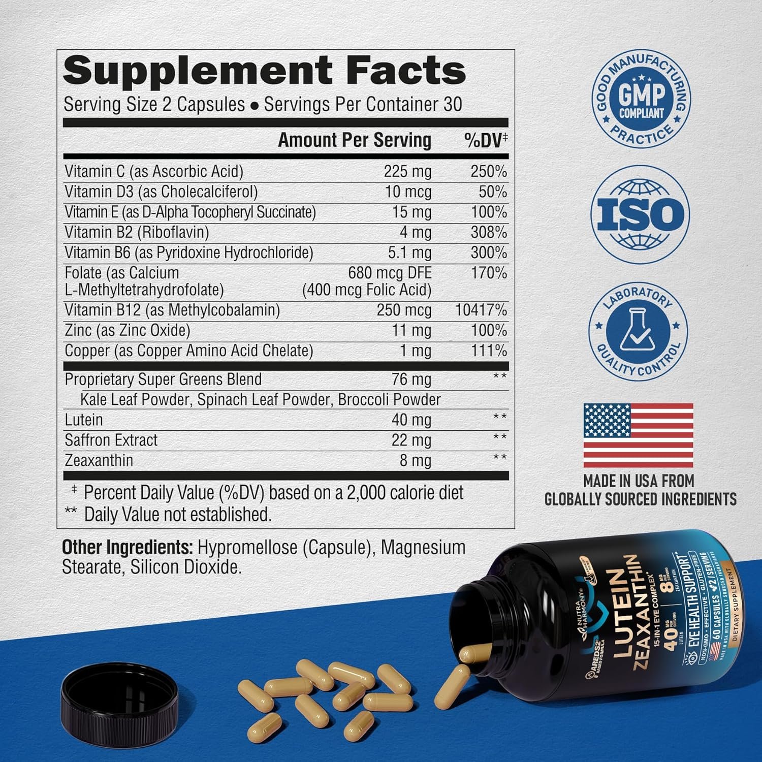 AREDS2 Based Formula — 15-in-1 eye vitamins complex scientifically backed for long-term eye care! Harnesses the power of essential nutrients for optimal eye health. Advanced complex with AREDS2-tested Lutein, Zeaxanthin, Saffron, Copper, Vitamin E, and Zinc, enhanced by essential eye health vitamins: B2, B6, B9, B12, C, and D3 with Super Greens: Kale, Broccoli, and Spinach