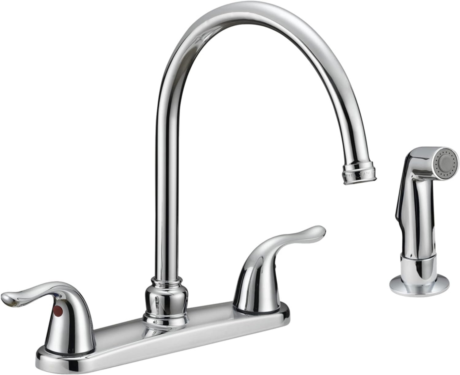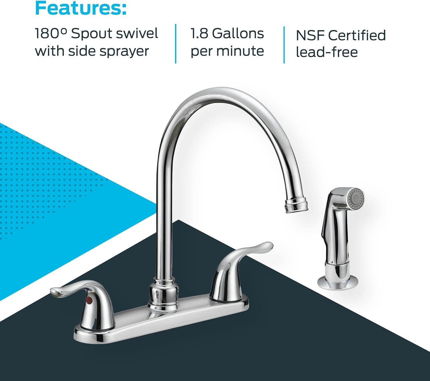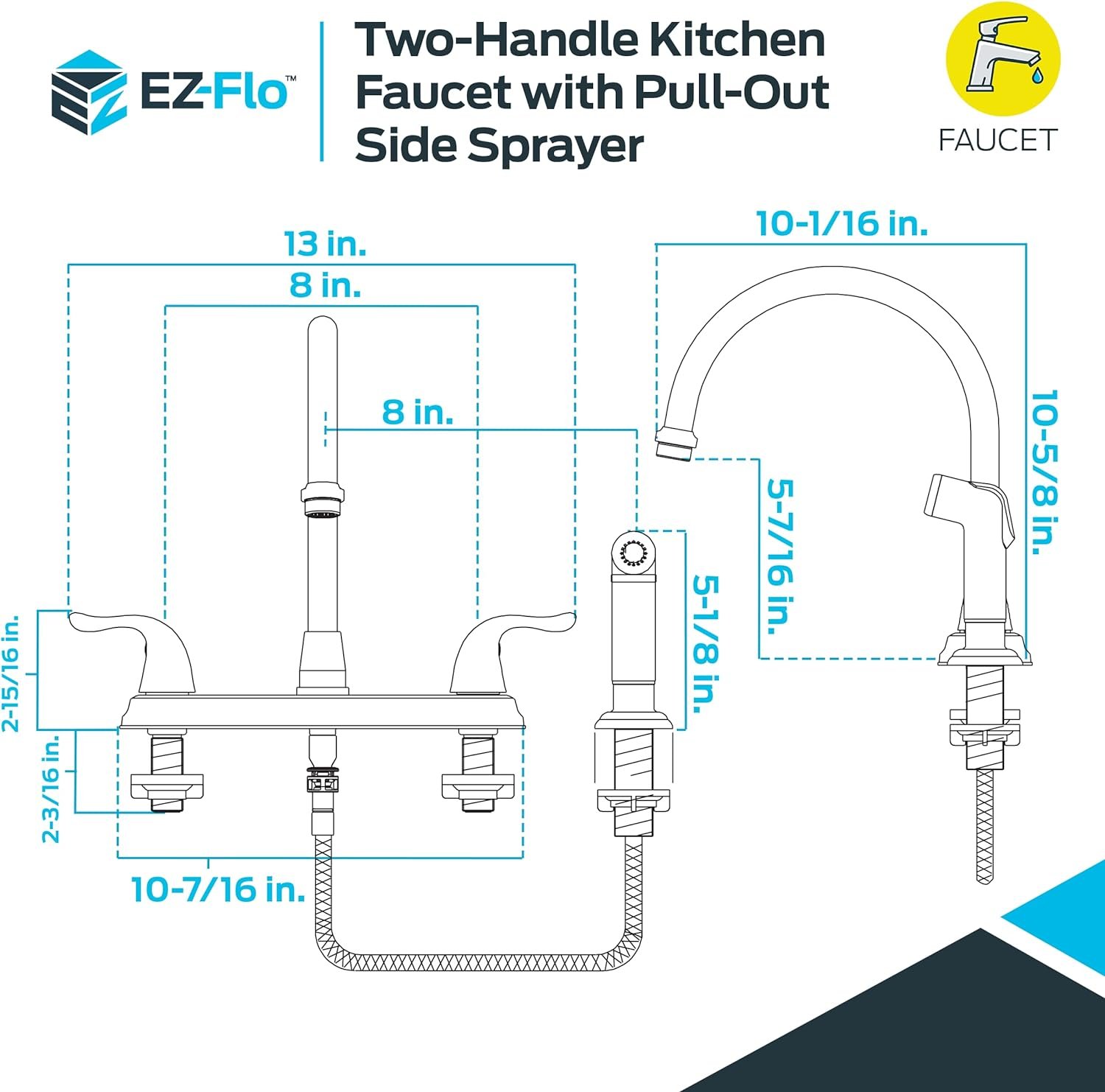 Add a classic, contemporary touch to your home kitchen decor with the EZ-FLO 2 handle kitchen sink faucet. The high arc spout allows for more work space while adding a captivating visual interest to its outline, provides a 180 degree spout swivel for easy transition between sinks, and the features 2 handles for hot and cold water temperature. The matching pull-out side sprayer comes with a 48 inch extended hose with a retractable mechanism which allows for effortless maneuvering in your kitchen sink space. This 2 handle sink faucet is composed of lead free materials for safe water drinking, and features convenient 4 hole installation.