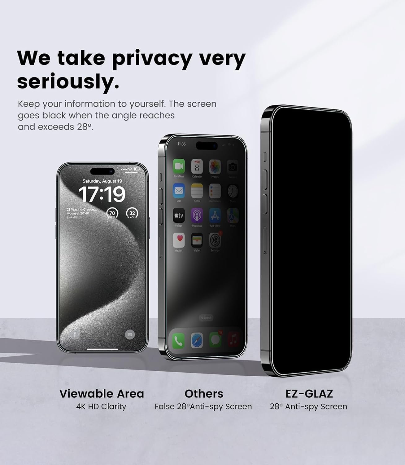 💎【Comprehensive Protection & Excellent Privacy Protection】Preserve the quality and clarity of your iPhone 15 Pro Max 6.7-inch display without sacrificing protection. EZ-GLAZ Privacy screen protector realizes 28° super privacy function. When you’re in an elevator, subway, bank, or other public places, block sights trying to see your secrets from both sides. Relish in the same original clarity while relying on our trusted screen protection to prevent blemishes on your iPhone 15 Pro Max 6.7-inch.