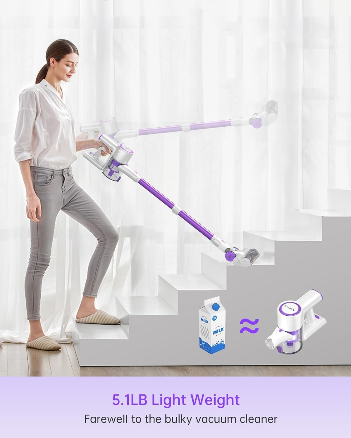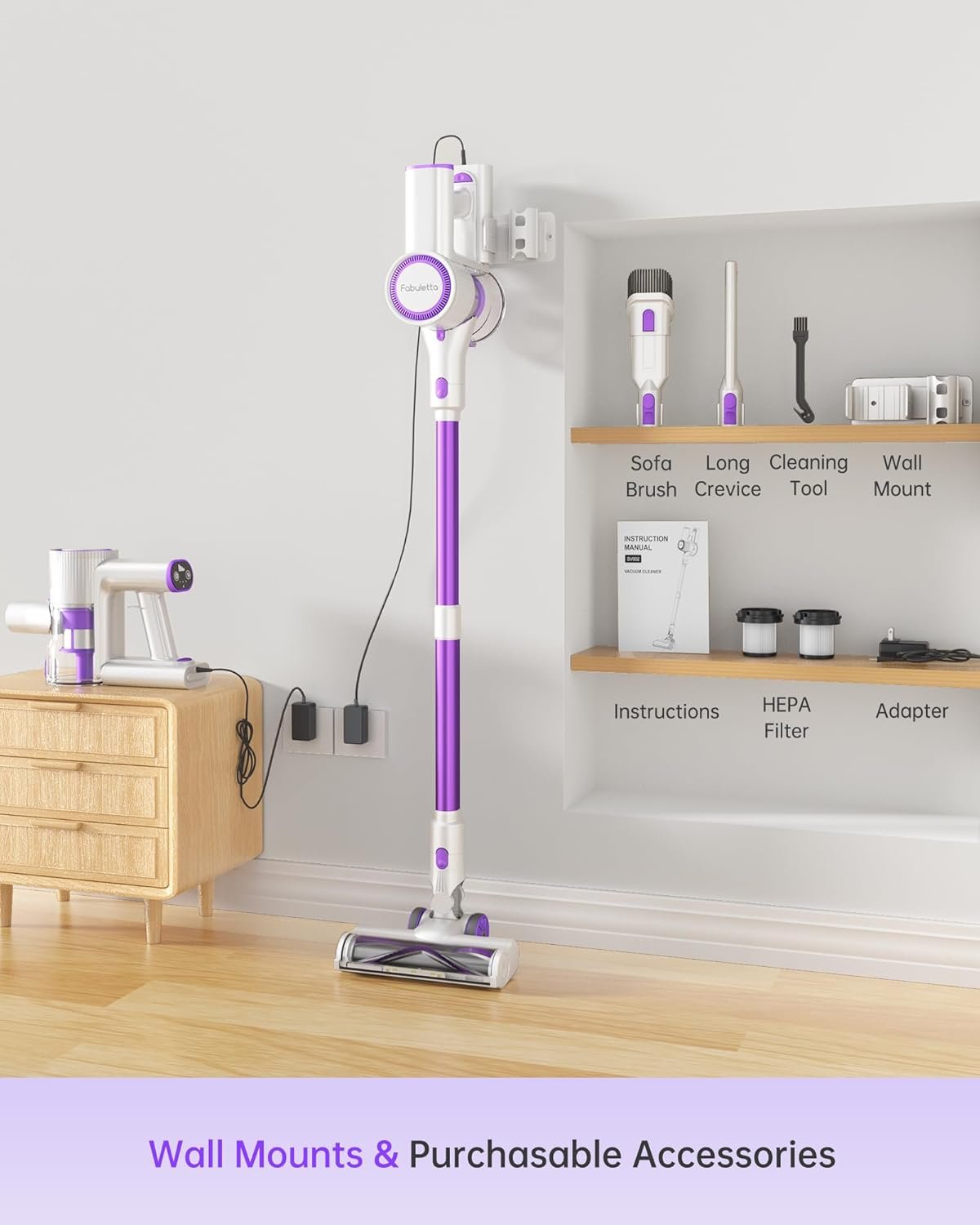 【Cordless & Multiple Attachments & Wall Mount Design】The Fabuletta hardwood floor vacuum is designed for wall mounting, making storage convenient. Moreover, it weighs only 5.3LB and comes with multiple brush heads, allowing you to assemble it with the extendable pole to clean floors, carpets, stairs, carriages, offices, and curtains. This cordless stick vacuum is the best choice for holiday/birthday!