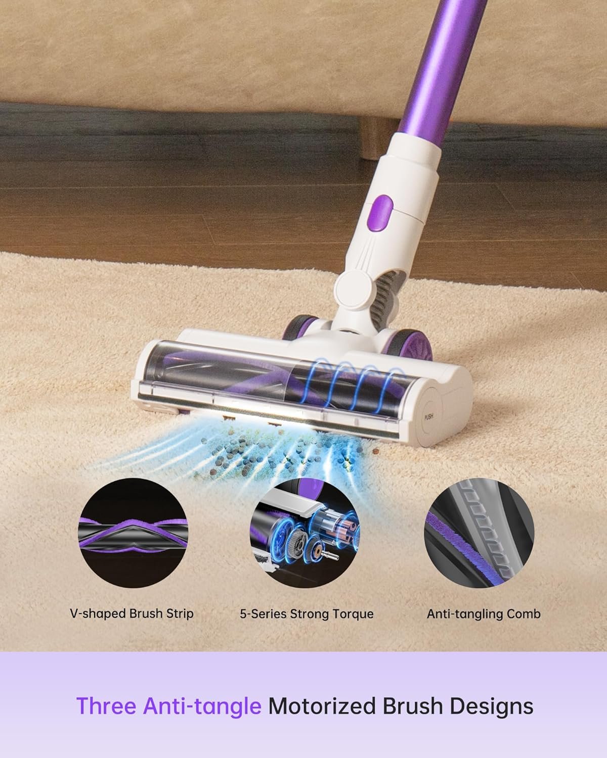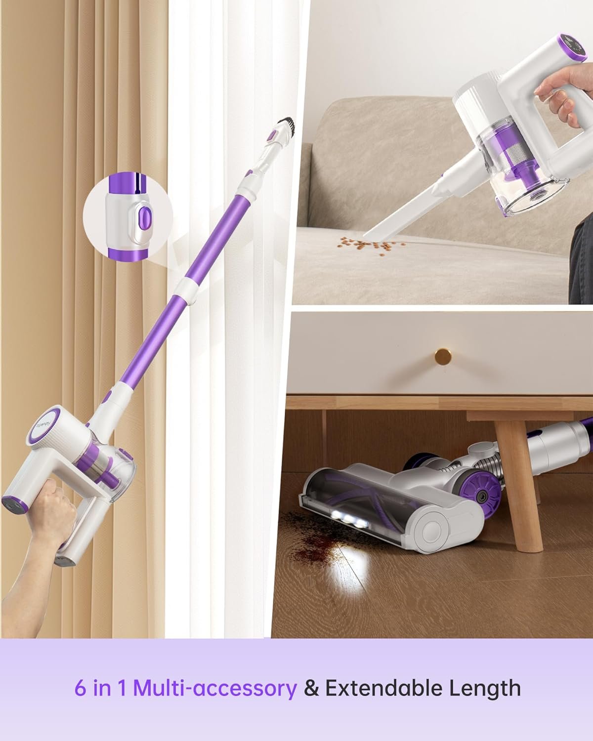 【LED Screen & Rotatable Cordless Vacuum】The floor brush can rotate between 90° and 180°, featuring a V-shaped anti-tangling design for easier cleaning. Additionally, the LED light design is perfect for cleaning debris, dust, and pet hair in the dark. The LED display screen intelligently shows the battery level, suction power, floor brush blockage alert, and dust cup full alert.