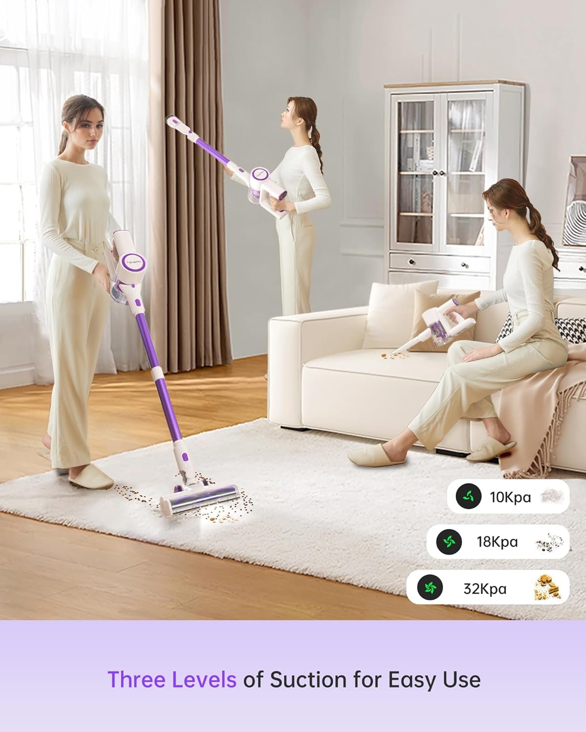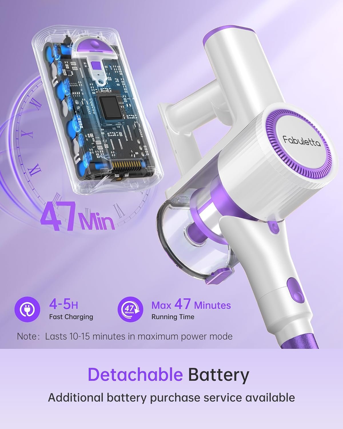 【400W Strong Suction & MAX 47MIN Battery Life】The Fabuletta cordless vacuum cleaner uses a high-speed BLDC brushless motor, which can switch between 3 modes: low, medium, and high. With removable rechargeable batteries, it can run for 10-47 minutes. It can also be disassembled and charged separately, and you can purchase additional batteries to extend the usage time of the stick vacuum cleaner! It is perfect for single apartments, pet households, and RV travel.
