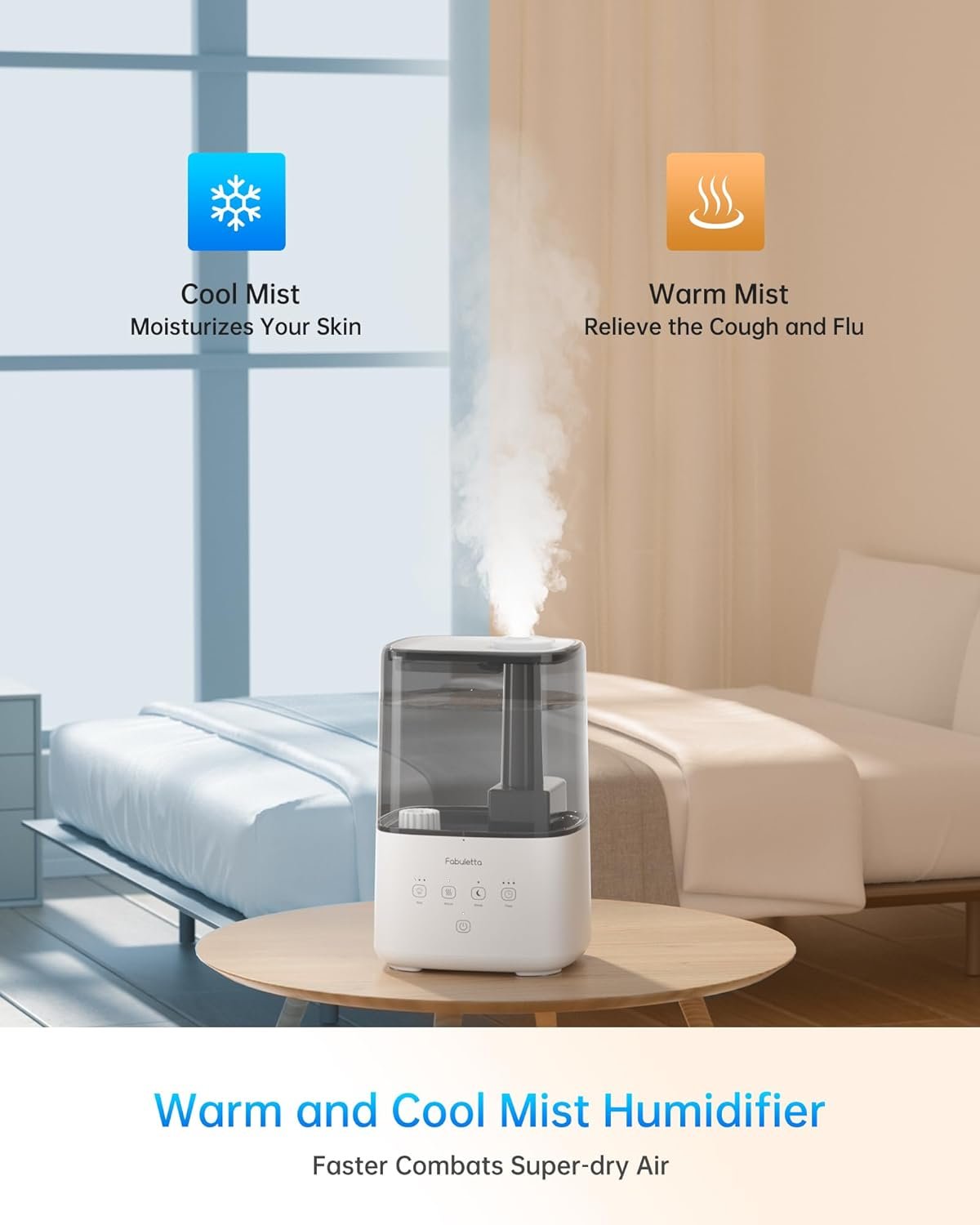 【Warm and Cool Mist Humidifier】: Experience the versatility of FABULETTA Humidifiers for home with both warm and cool mist options, easily switchable with a simple touch. In chilly and dry weather, warm mist diffuses faster, making it perfect for maintaining humidity in large rooms day and night. Create a comfortable and pleasant environment with this dual function humidifier.