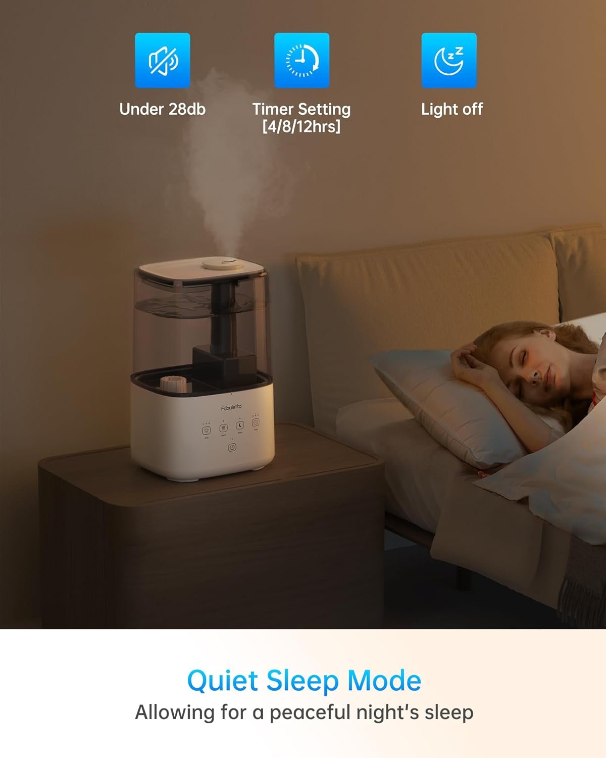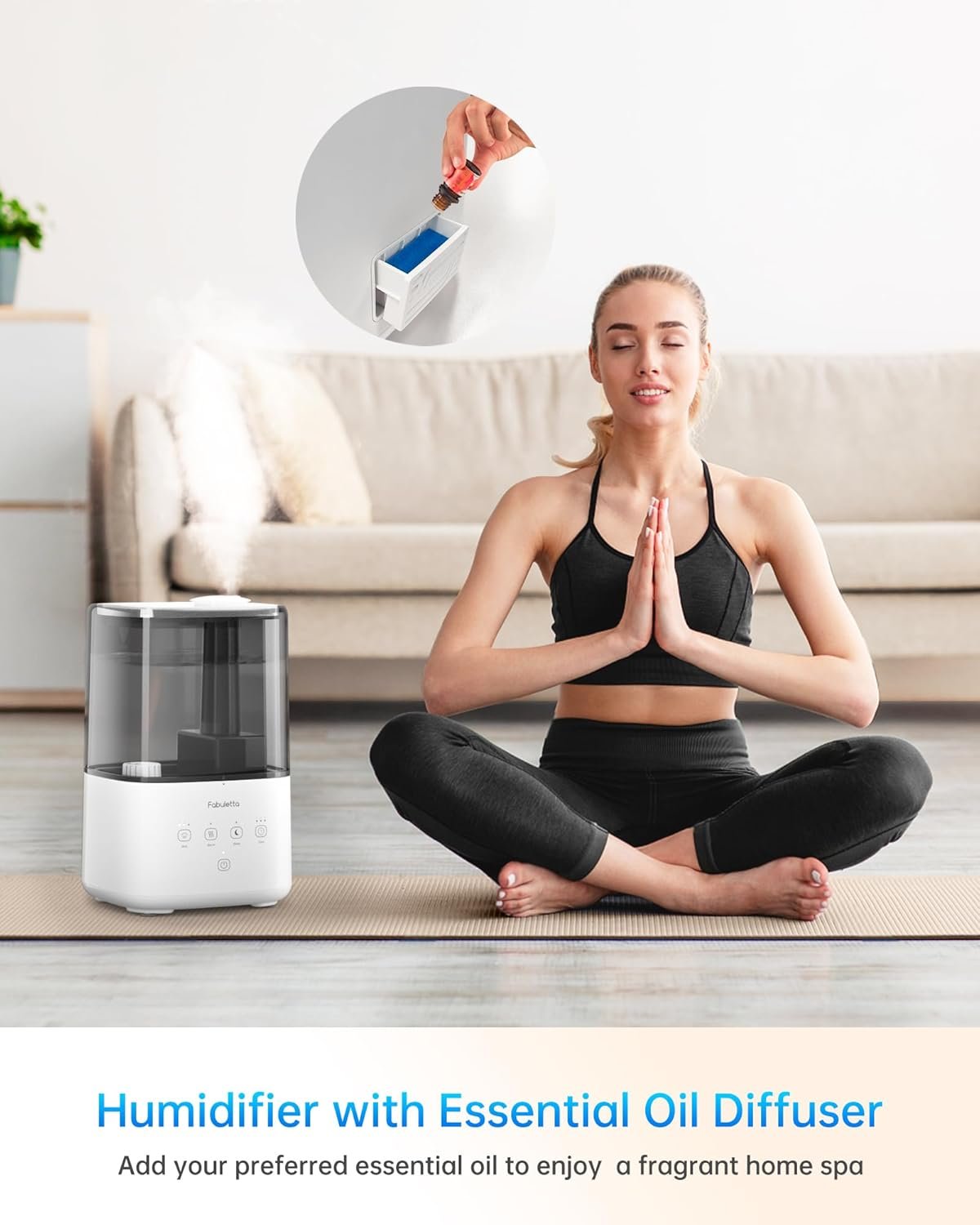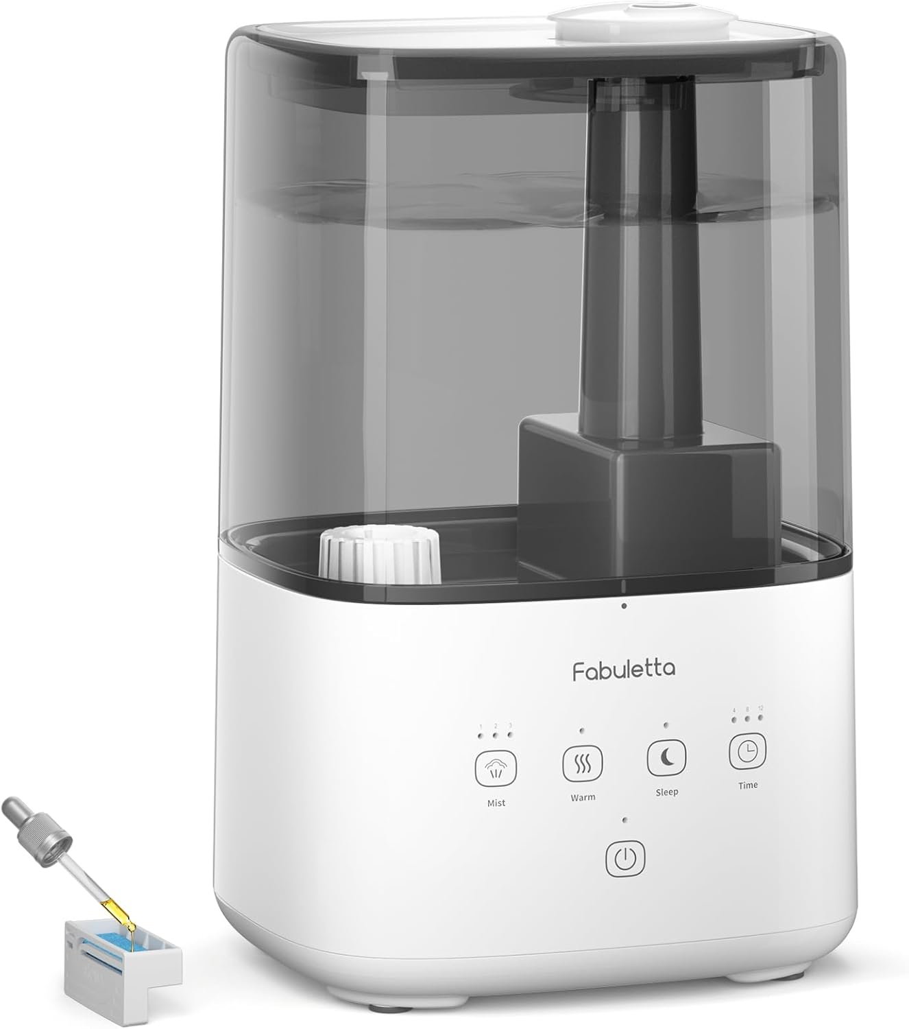 【Humidifier with Essential Oil Diffuser】: Elevate your space with FABULETTA air humidifier, as it doubles as an essential oil diffuser with its built-in tray. Simply add your preferred essential oil to experience a fragrant home spa. Perfect for bedrooms, homes, baby rooms, plants, and nurseries. (Note: Do not add essential oils into the water tank or base chamber)