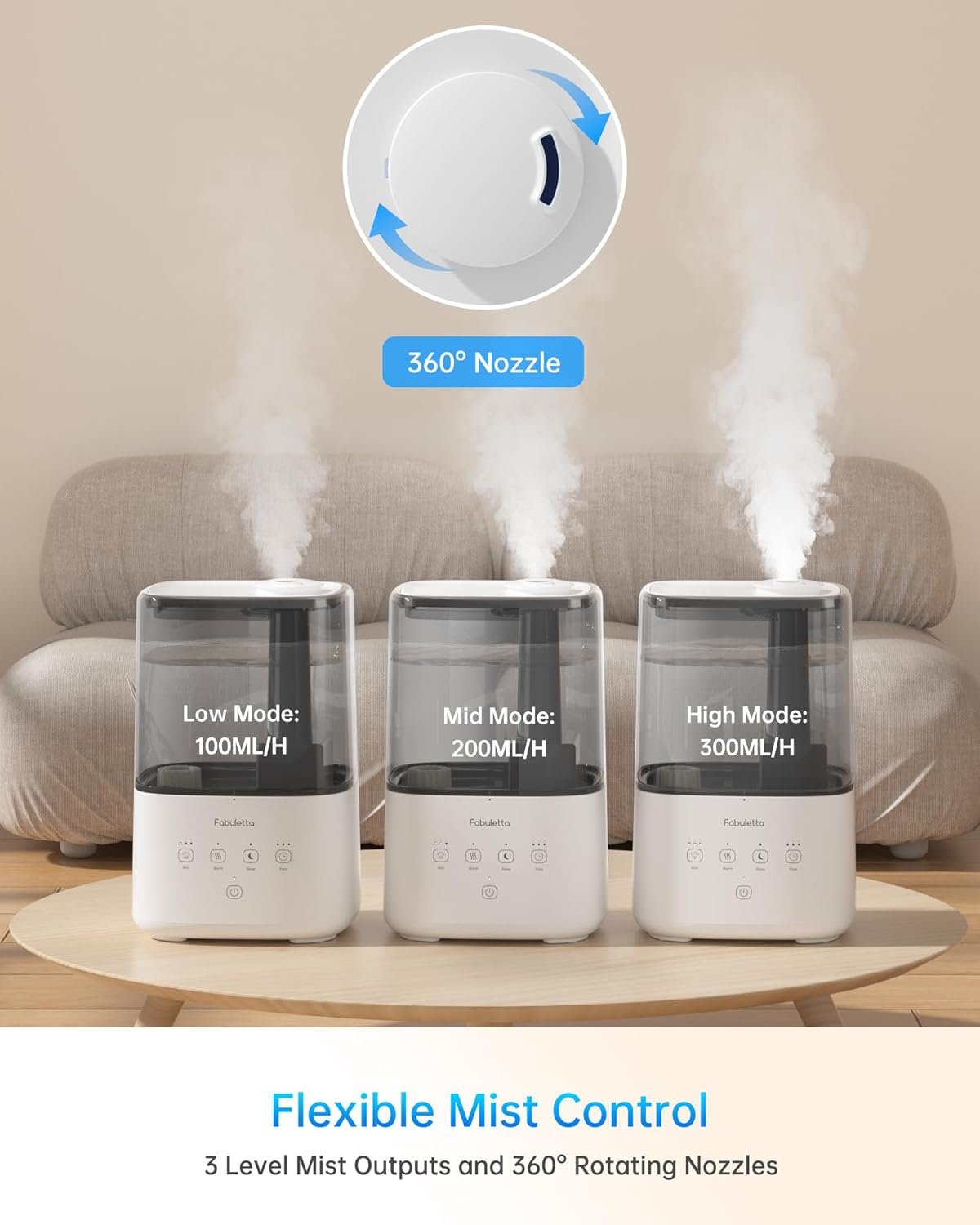 【Flexible Mist Control】: With the 360° rotating nozzles, FABLUETTA Humidifier Large Room could evenly disperse mist in any direction, providing the ideal humidity level and a soothing atmosphere. Choose from 3 adjustable mist levels to suit your specific needs. (Low Mode: 100ML/H, Medium Mode: 200ML/H, High Mode: 300ML/H)
