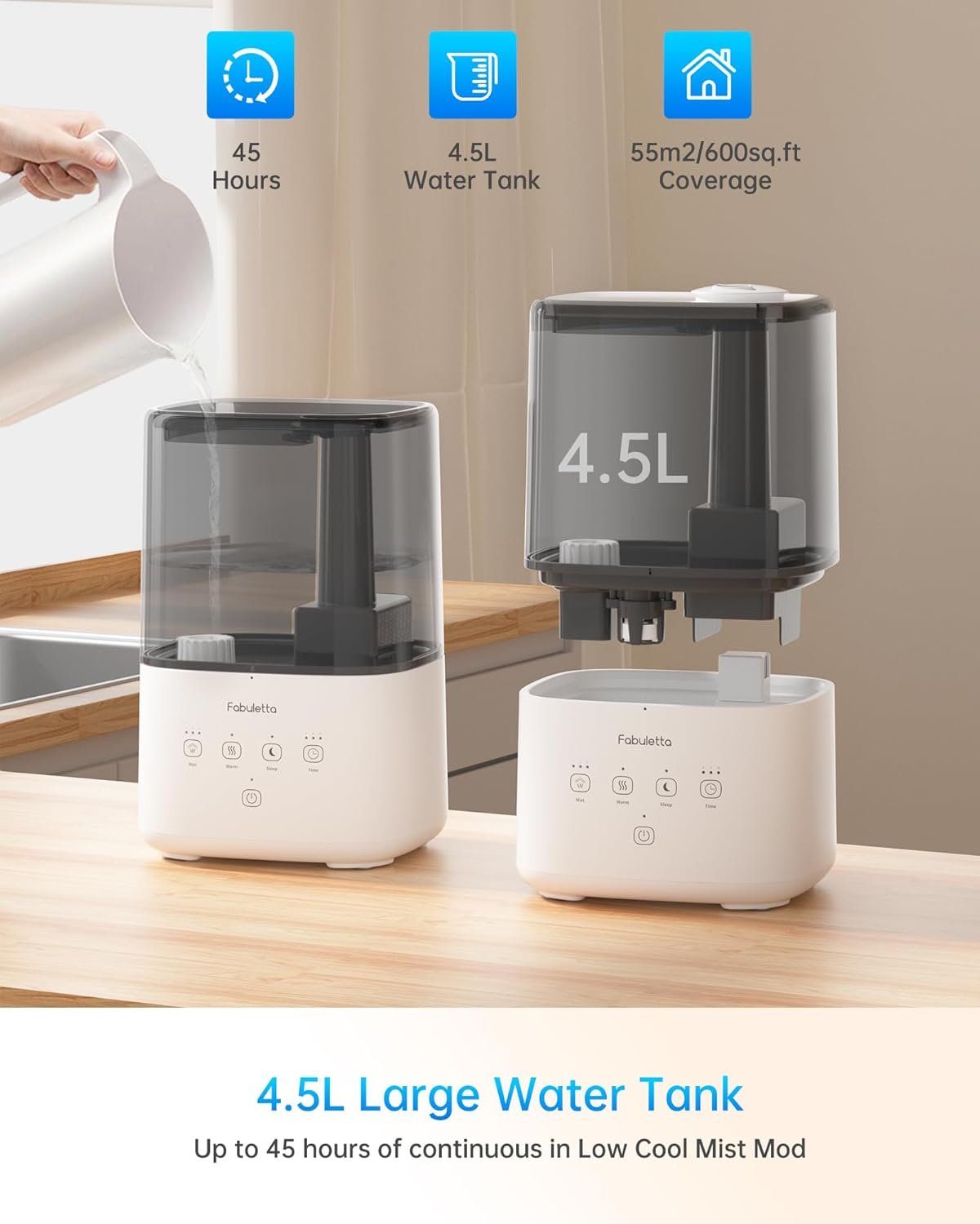 【Detachable Top-fill 4.5L Water Tank】: The humidifier for home large rooms boasts an extra-large 4.5L water tank, effectively covering up to 53m²/580 sq.ft. With a single fill, enjoy up to 45 hours of continuous operation. The FABULETTA bedroom humidifier features a user-friendly top-fill design and a detachable water tank, making water refills and deep cleaning a breeze.