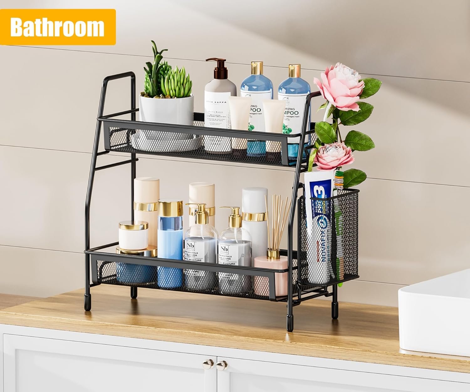 Space-Saving: 2-layer bathroom and kitchen orgainzer rack(13.8″x7″x12.6″) are ideal for storing spices, lotions, make-up, shampoo, toothbrush holders, and other cosmetics. Useful in any house room, including the kitchen, bathroom, under sink organizer, bathroom countertop, office, and so on