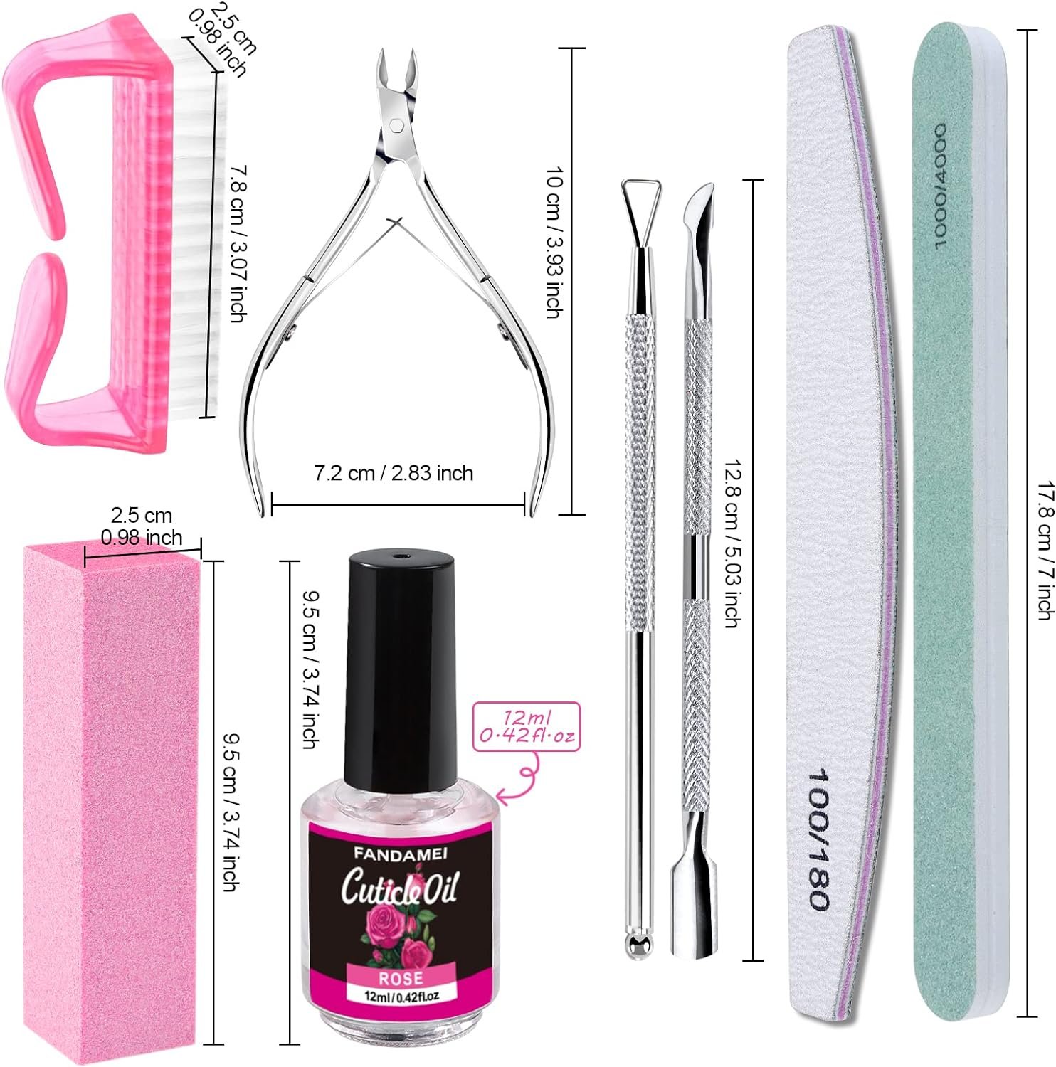 Package Included: 3PCS 100/180 grit double sided nail files, 2PCS white and green nail polishing buffer, 1PCS pink rectangular nail buffer block, 1PCS cuticle nipper, 1PCS cuticle pusher, 1PCS cuticle peeler scraper, 1PCS 12ml/0.42oz rose nail cuticle oil and 1PCS nail dust brush. Professional manicure tools kit for daily nail care use and salon.