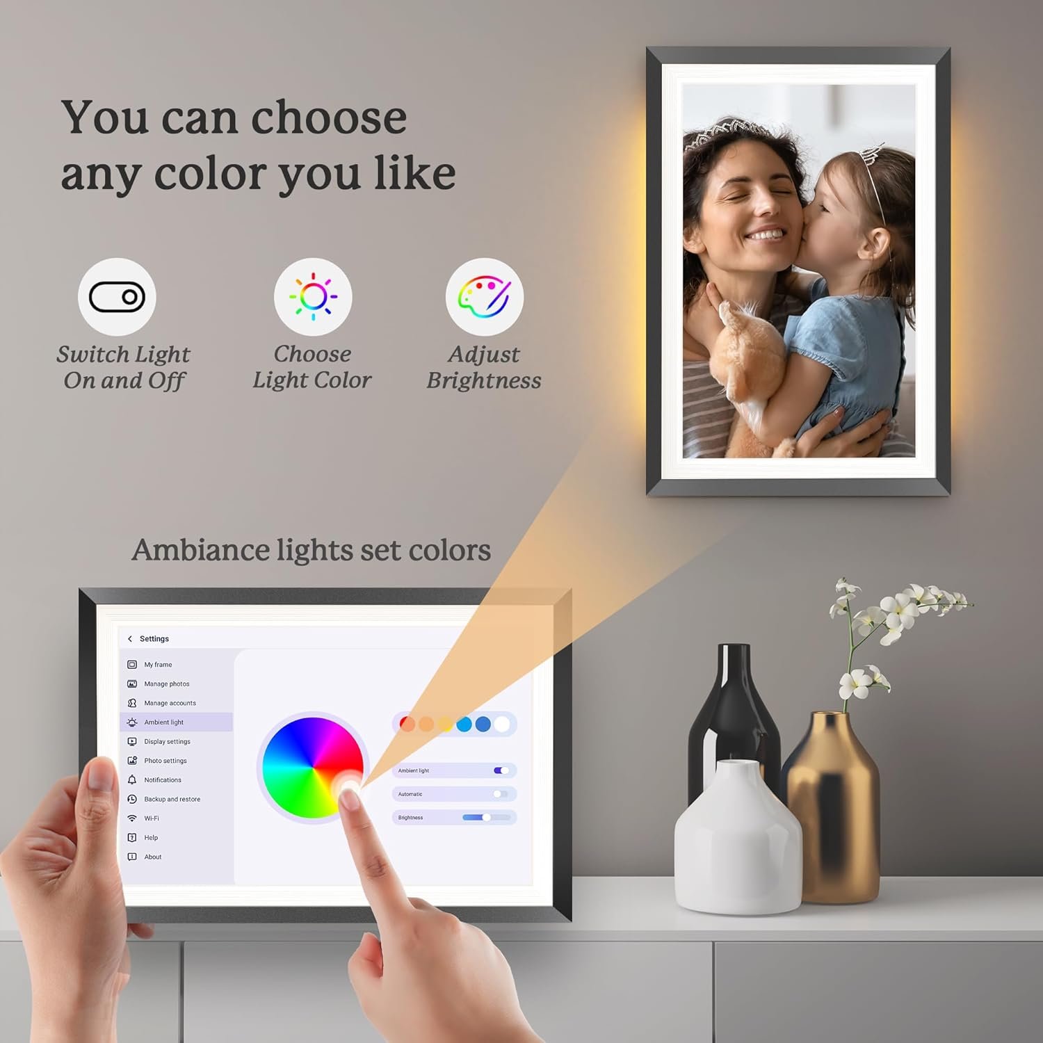 Illuminate Memories with 16M LED Colors:FANGOR LED light picture frame enhances your digital picture frame experience with a customizable LED lighting effect featuring an impressive array of 16 million vibrant colors. Adjusting the color and brightness of the light adds atmosphere to the digital LED frame and makes the photos and videos vivid.
