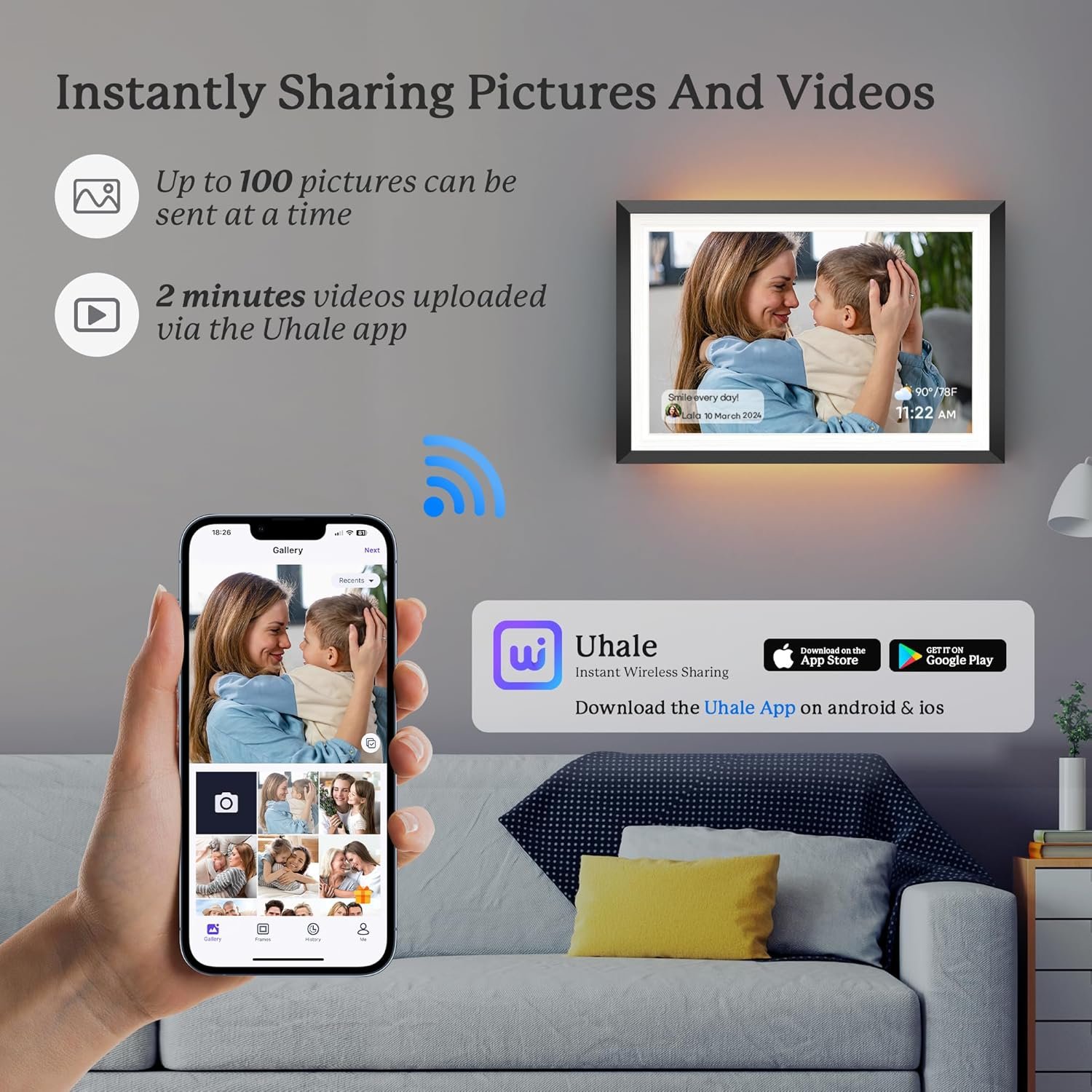 Easy Set-up:①Download the Uhale APP. ②Scan the QR code or enter the frame ID to connect. ③Effortlessly share photos or videos through the Uhale APP. Suitable for all age groups including older, this digital photo frame with LED light lets you transmit images or videos in seconds, keeping everyone connected and relishing cherished memories from any location.