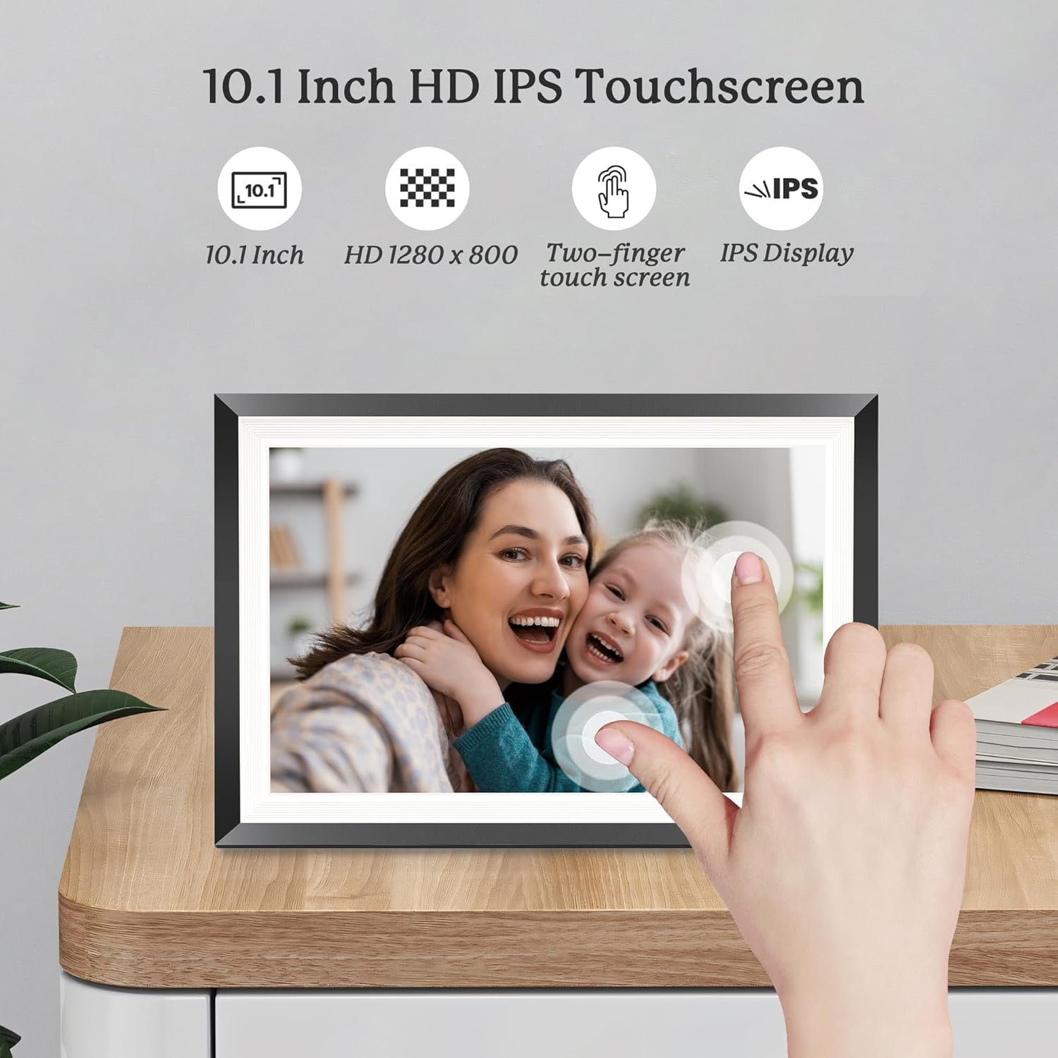 10.1 Inch IPS HD Touch Screen:10.1 Inch IPS HD Touchscreen has photo frame led light 1280*800 The resolution allows you to see the photos clearly at any angle. This advanced technology empowers you to edit photos seamlessly, utilizing two-finger zoom gestures for precise control. You can use this high-definition touch screen to adjust the brightness of the LED light, the volume and brightness of the electronic picture frame, delete photos, videos, etc.