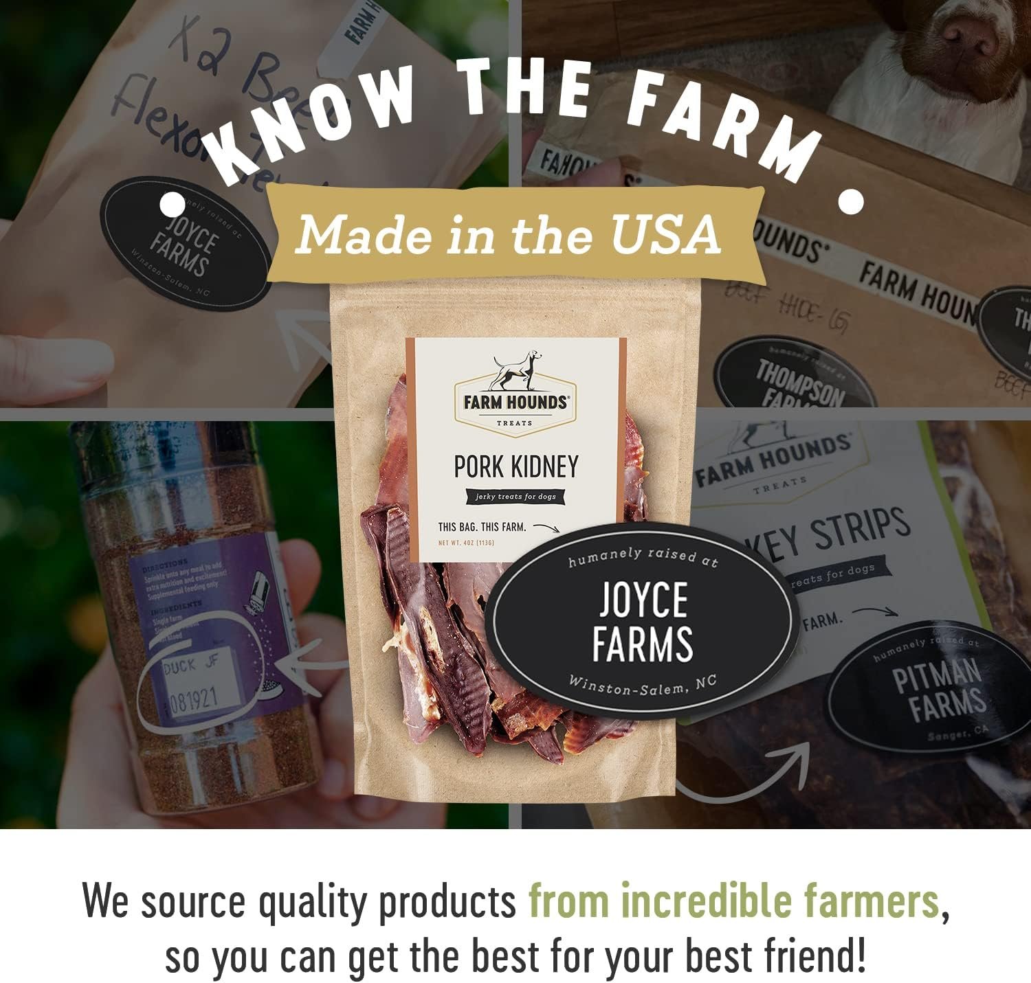 FARM HOUNDS – At Farm Hounds, we believe healthier animals are happier animals. With your canine in mind, we make all of our treats nutritionally beneficial and delicious. Our close relationship with all-American family farmers who raise their animals in a humane way, helps us use premium raw materials for our products.