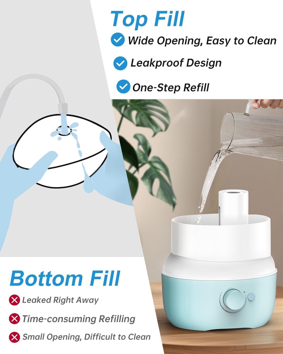 【Top-Fill & Easy to Clean】Easily refill from top of the small humidifier, making refilling a breeze-no need to flip or tip! Enjoy peace of mind with a leak-proof design that prevents messy spills, reducing mess and hassle. With no need for expensive frequent filter replacements, maintenance is minimal and cost-effective, with its simple structure, you can maintain a hygienic environment effortlessly, letting you focus on what matters most-your family’s comfort.