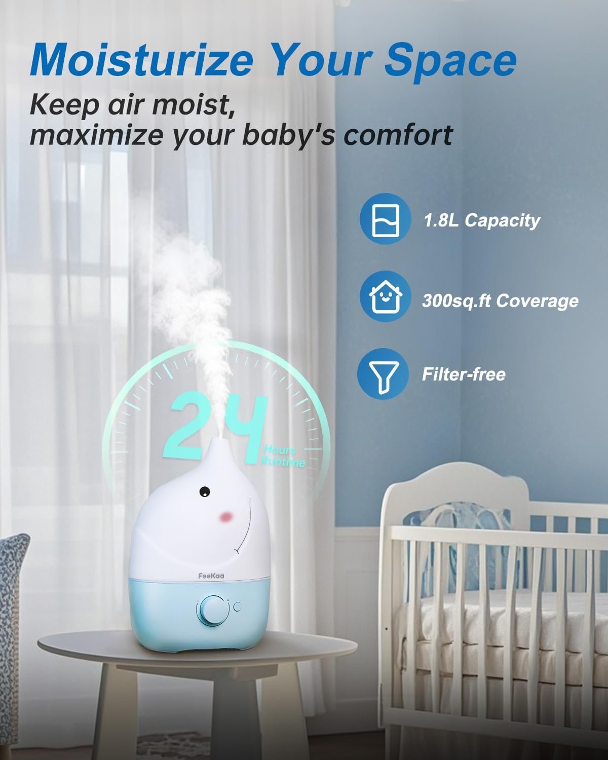【Easy to Use Humidifier & Essential Oil Diffuser】Featuring a 1.8L/0.48Gal water tank, this baby humidifier efficiently covers up to 300 sq. ft., delivering customizable different mist levels with an easy-to-use knob, reliefs dry skin, dry throat, sinus, ease congestion and help plants thrive. Add a few drops of essential oil to the water tank for soothing scents to create a calming atmosphere for your baby. Enjoy the benefits of both humidification and aromatherapy!