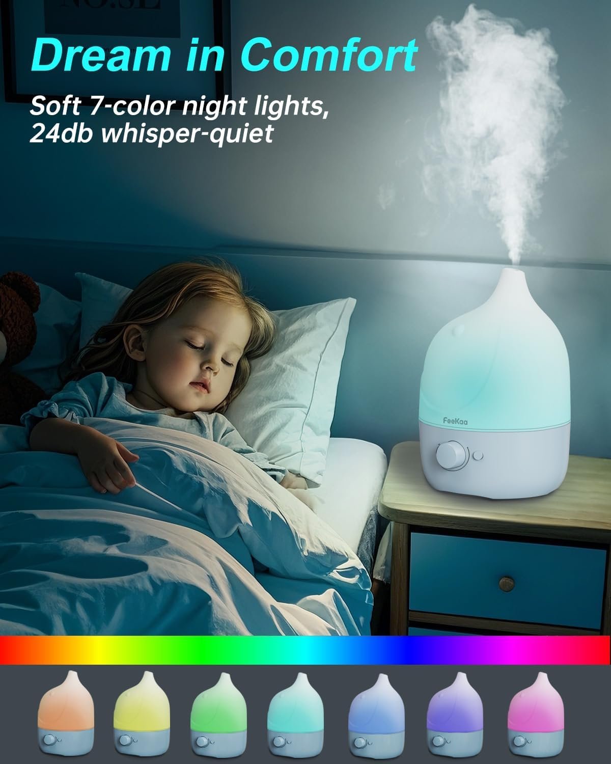 【7-Color Night Light for Peaceful Sleep】Equipped with an independent light button, easily use the calming 7-color night light on its own, you can cycle through 7 soothing colors or fix your favorite to create a cozy environment that encourages restful sleep and sweet dreams. The quiet operation at ≤24dB ensures it won’t disturb both baby and parents’ sleep, while humidifiers for bedroom baby runs continuously for up to 24 hours, ensuring all-night comfort.