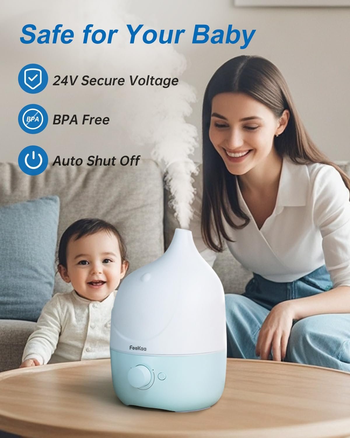 【Safe & BPA-Free for Your Little One】Safety is our priority! This cool mist humidifiers is made from BPA-free materials, ensures that no toxic substances can leach into the water or air, and features an automatic shut-off when water runs low, preventing any accidents. Designed with a low 24V safe voltage for added safety, minimizes the risk of electric shock and overheating, ensuring the ultrasonic humidifier operates safely in a nursery environment.