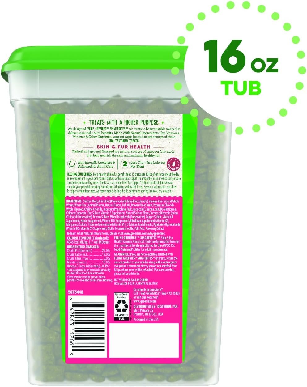 Contains one (1) 16 oz. tub of FELINE GREENIES SMARTBITES Skin & Fur Natural Treats for Cats Salmon Flavor