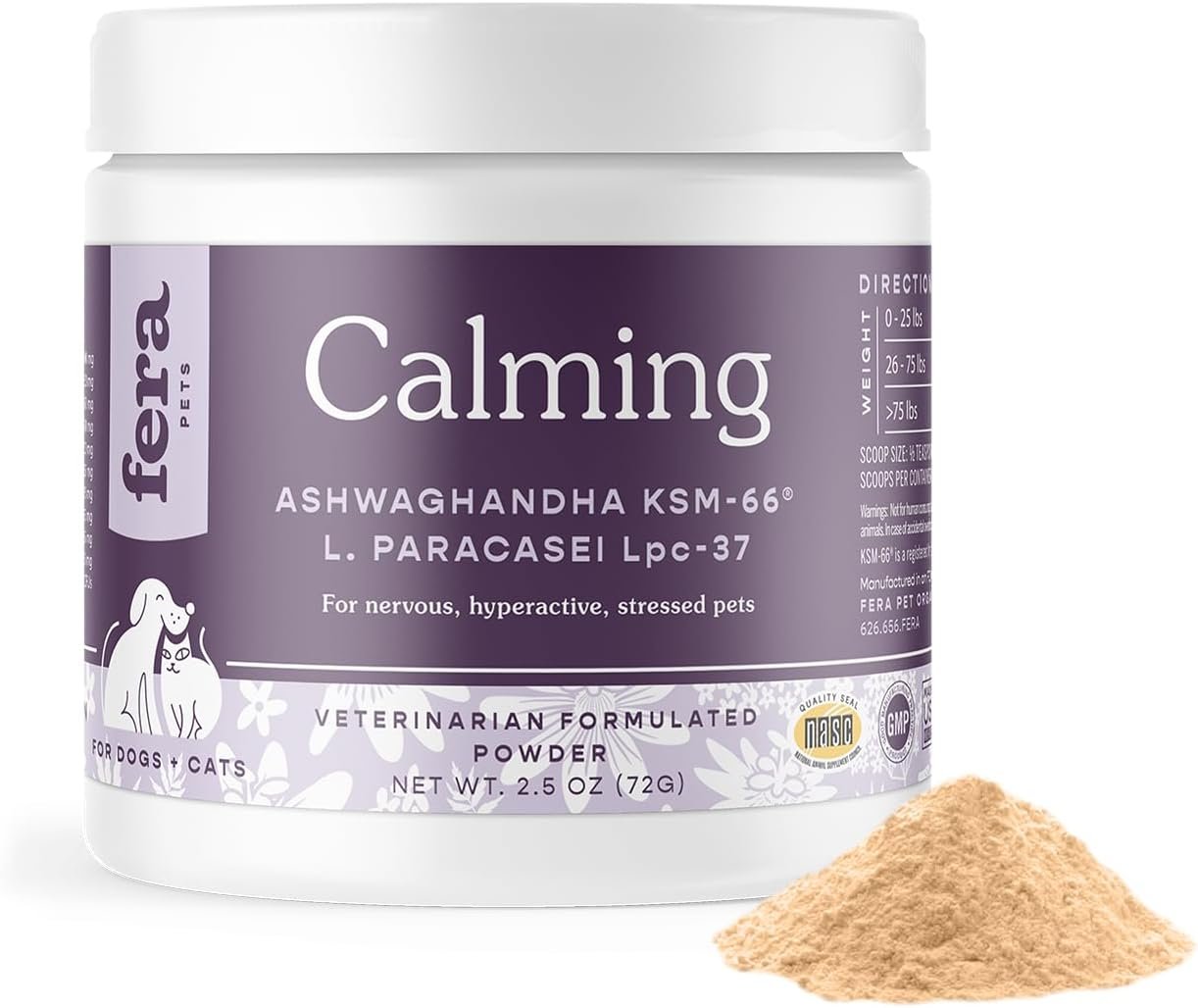 Easy pet relaxation: Fera’s Calming aid is a powerful mix of botanicals like ashwagandha, neurotransmitters, and probiotics for dogs and cats for an overall balanced mood