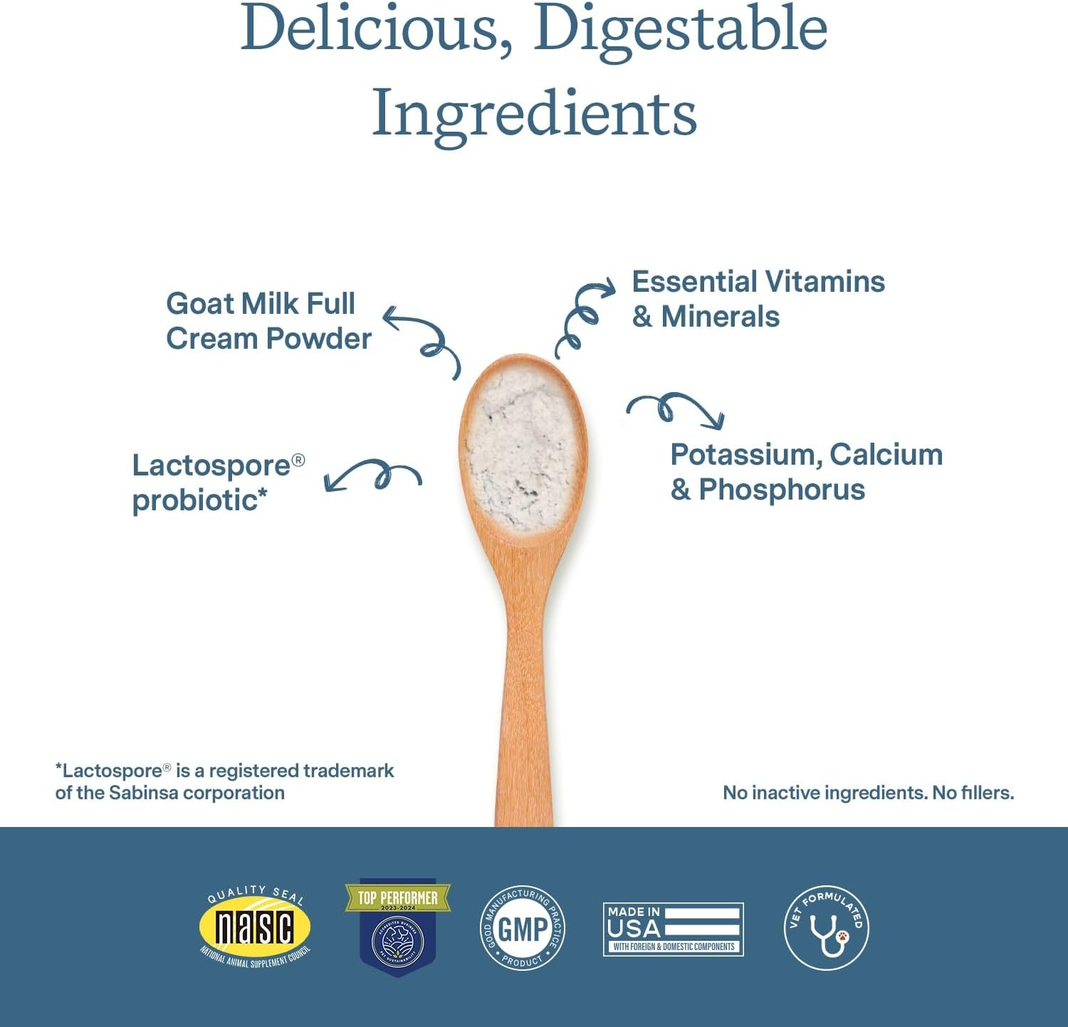 No fillers: This cat and dog supplement is made with essential vitamins and minerals like calcium, potassium, phosphorus, plus Lactospore cat probiotic and dog probiotic; made with full cream goat milk for easy digestion