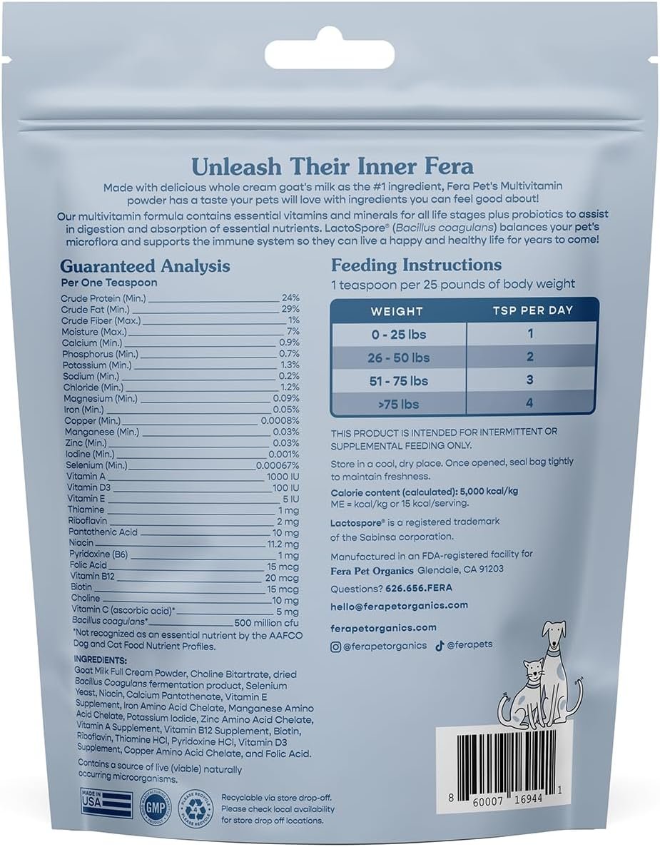 Dog and cat vitamins: Fera’s Multivitamin goat milk contains a full range of vitamins and minerals, as well as probiotic for dogs and cats to keep your pet active and happy