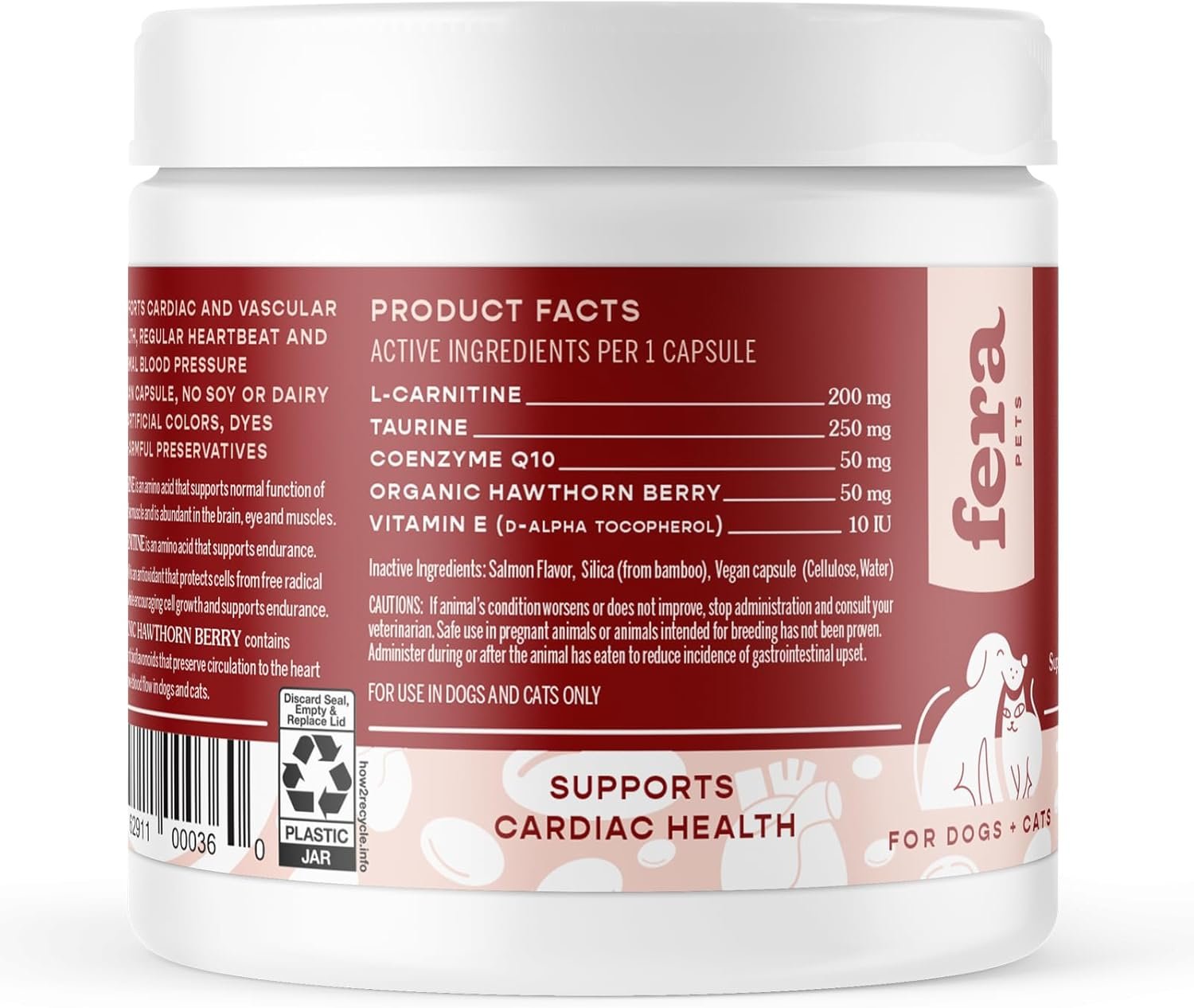 Caring for cardio: Fera’s heart supplement with taurine for cats and dogs helps the cardiac muscle with normal blood circulation and heartbeat and boosts your pet’s energy for play