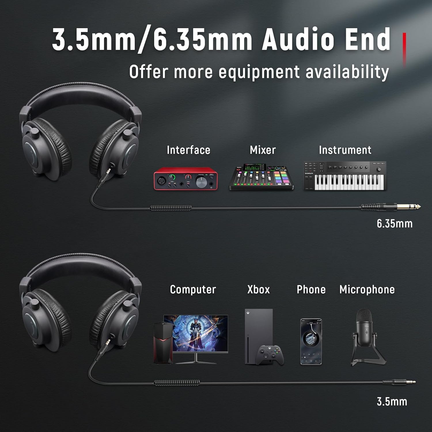 [EXTENSIVE COMPATIBLITY] The over ear headphones wired expand the efficiency of your devices. Two 9.8ft detachable DJ-style coiled cables with 3.5mm and 1/4’’ audio plug ensure a wide-ranged of connection with mixer, audio interface, amp and mic with headphones jack. No extra adaptor is required for the over-ear headphones when switching different devices for a improving monitoring productivity.