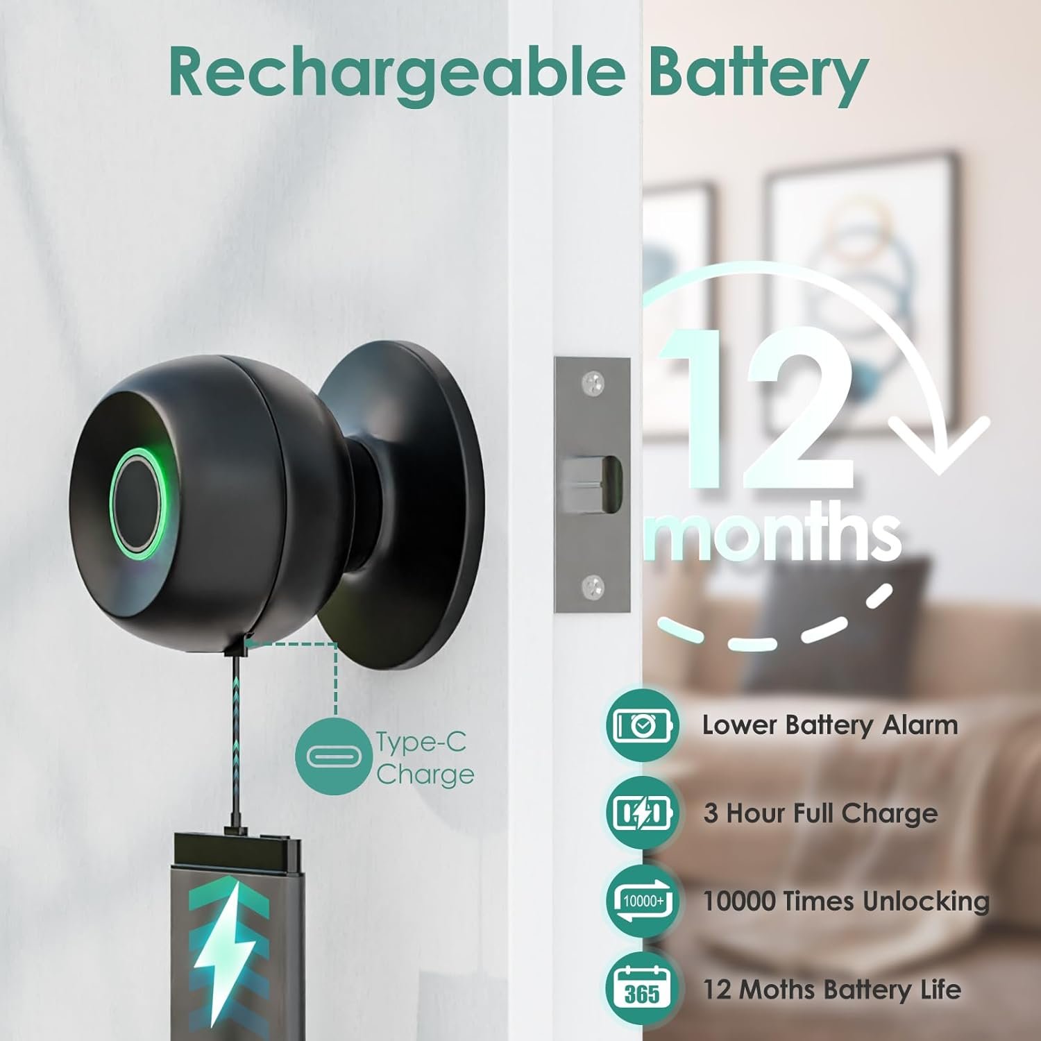 【Rechargeable Battery & Easy Installation】: Smart Door Knob built-in 400mAh rechargeable battery and with a Type C port for emergency use. It takes 3 hours, can be last up 12 months and be used for 10000 times door unlocking. Smart Fingerprint Door Lock fits most US door thickness 35 to 54mm, great for wooden doors, fire doors, security doors and very easy to install them with a screwdriver and with drilling a 25mm hole about minutes following the instruction