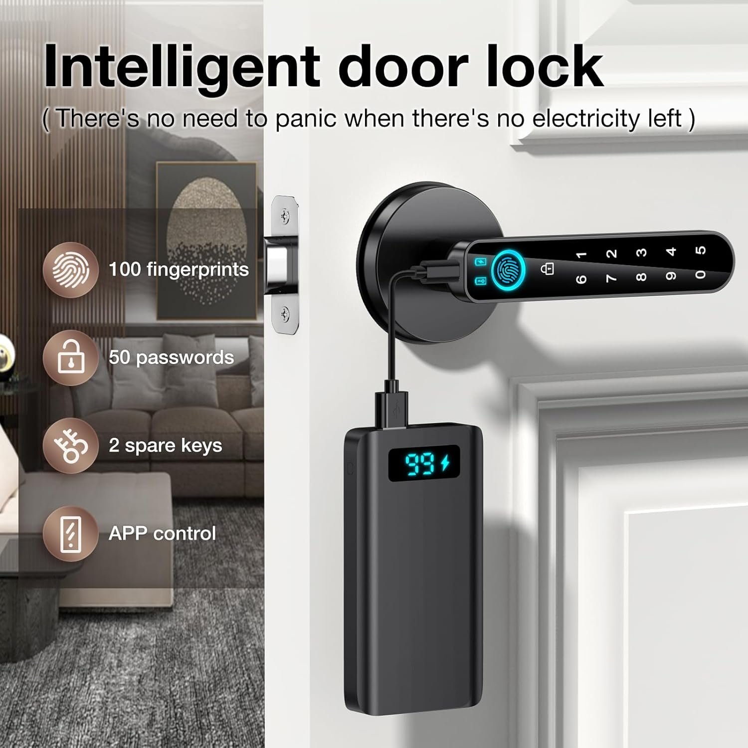 【USB emergency charging】Fingerprint Door knob It has a low battery alarm function and comes with a USB port for emergency charging.Requires 4 AAA batteries (not included)