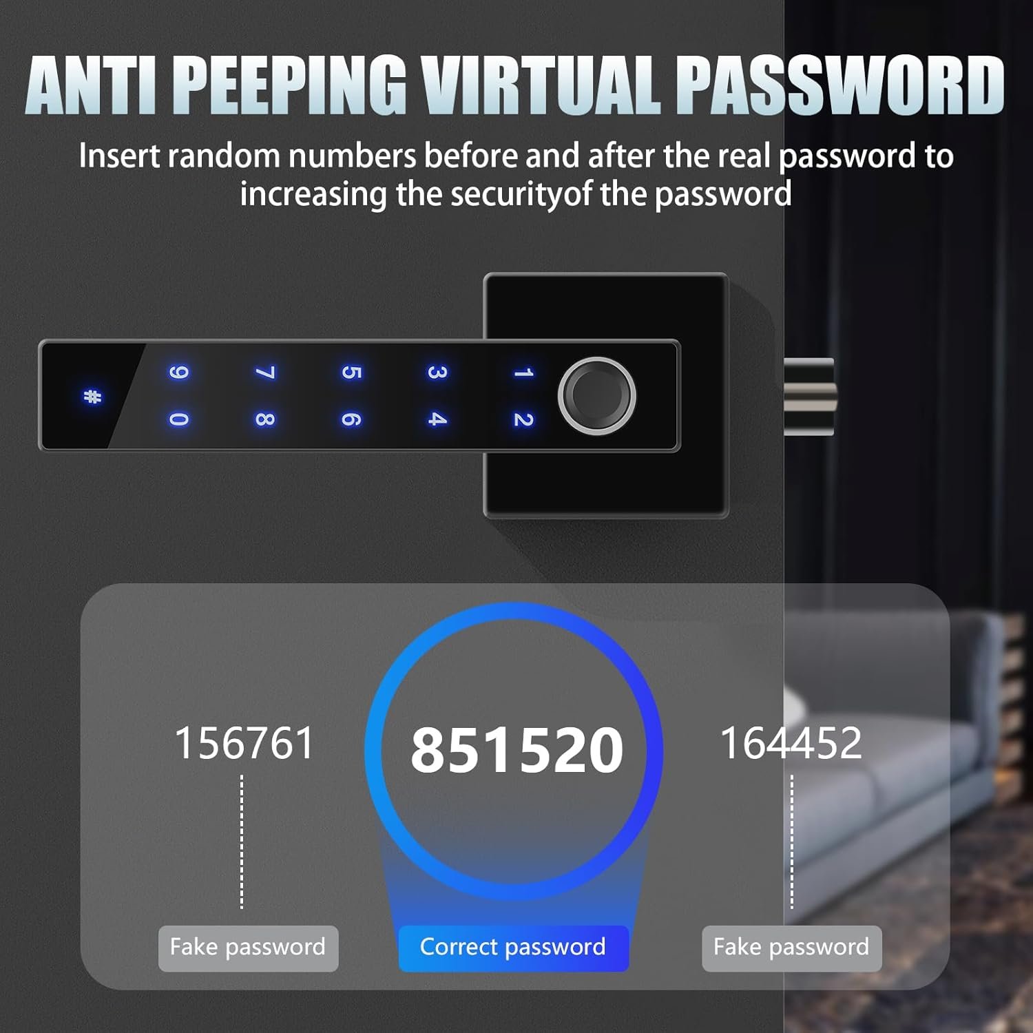 The digital door lock features an anti-peep touch screen and a virtual password design. You can enter a random series of numbers before and after the correct password to prevent others from discovering your real password. If you enter the wrong code, the Smart Lock will flash red. After a certain number of incorrect attempts, it will sound an alarm and lock the keypad.
