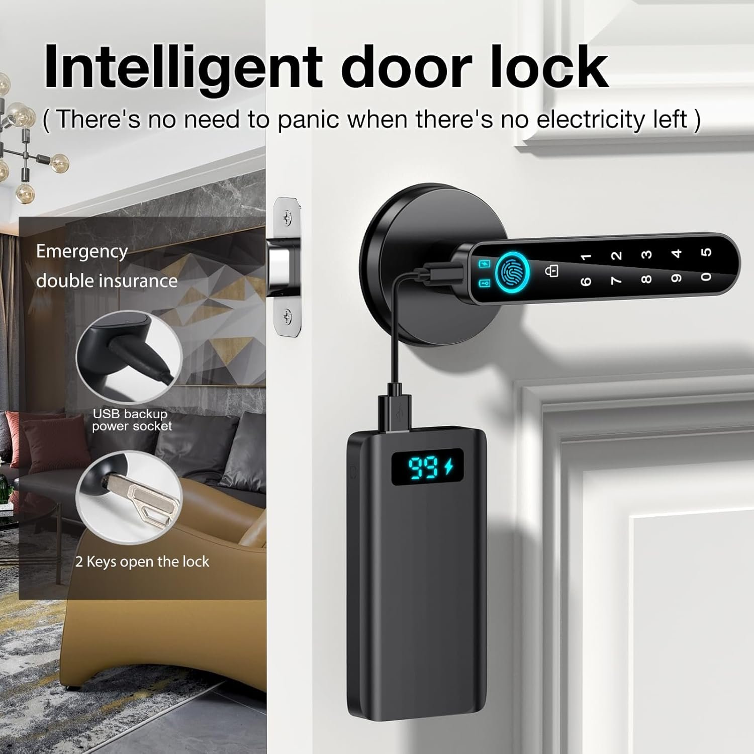 【USB charging】The fingerprint door handle has a low -power alarm function, and it is equipped with a USB port for emergency charging. It requires 4 AAA batteries (not included)
