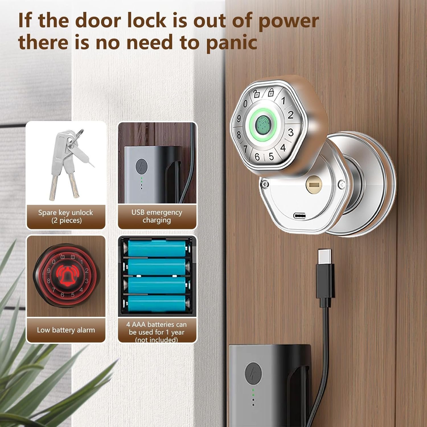 【USB charging】 Smart door locks have a low volume alarm and are equipped with USB ports for emergency charging. It requires 4 AAA batteries (not included)