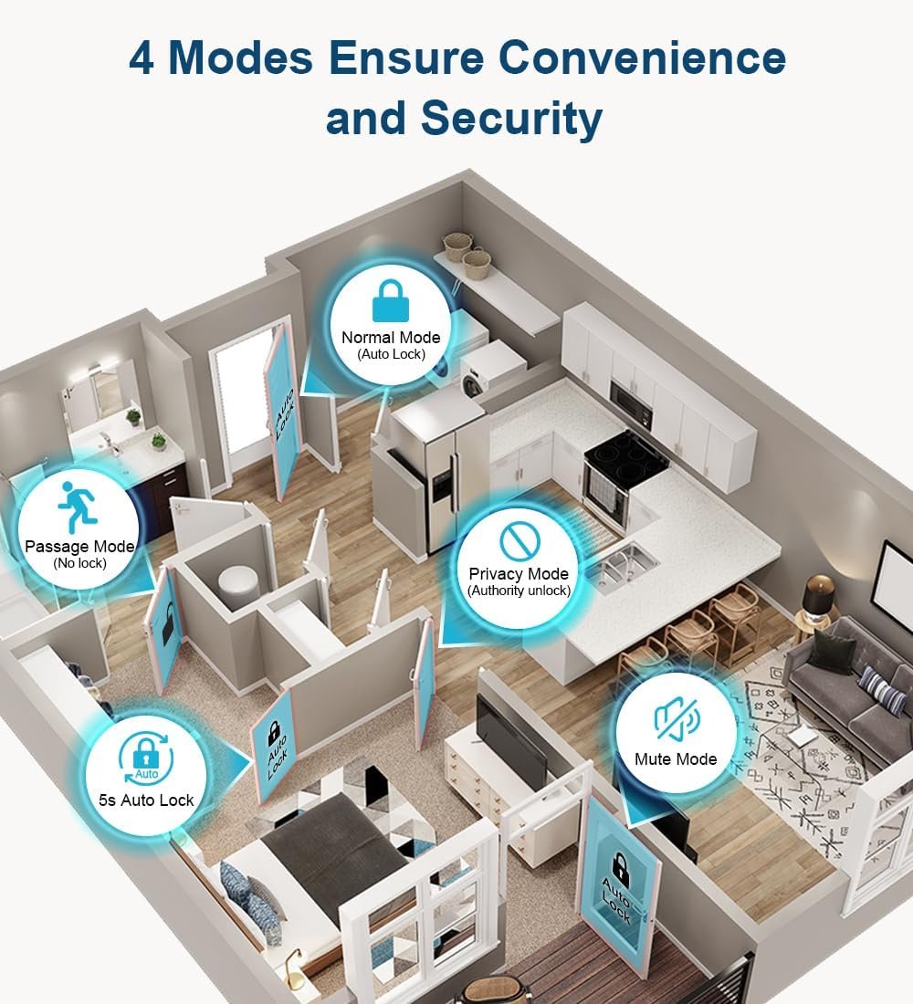 THREE MODES FINGERPRINT DOOR KNOB: Designed to provide convenience and enhanced privacy to homeowners. Easily switch modes by rotating your thumbprint around the smart door knob. The modes are passage mode, entrance mode, and privacy mode. Perfect bedroom door knobs with lock to keep unwanted guests like roommates or kids from entering your peaceful space.