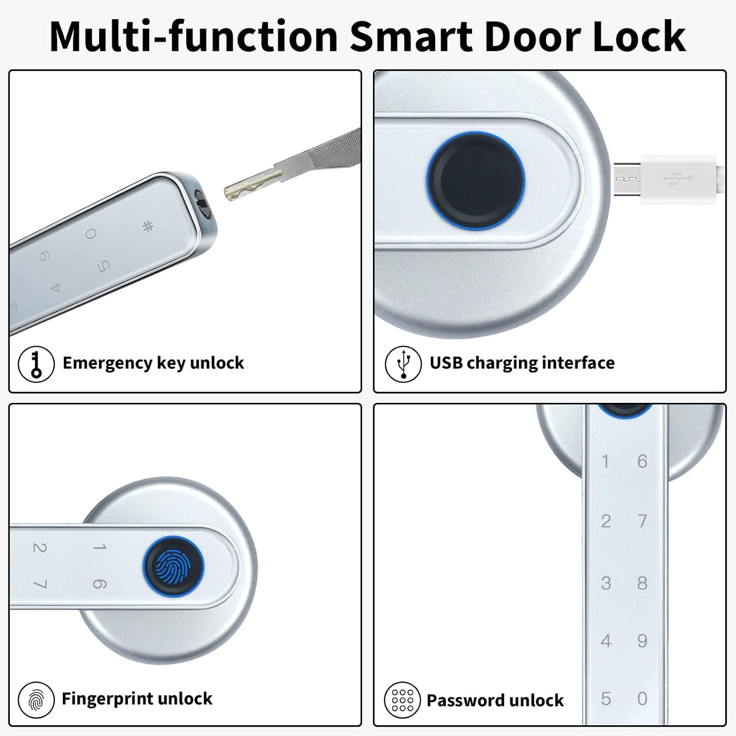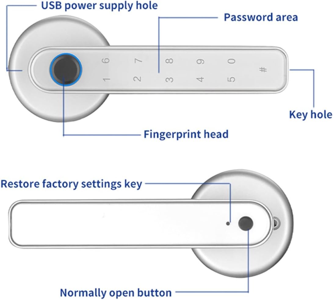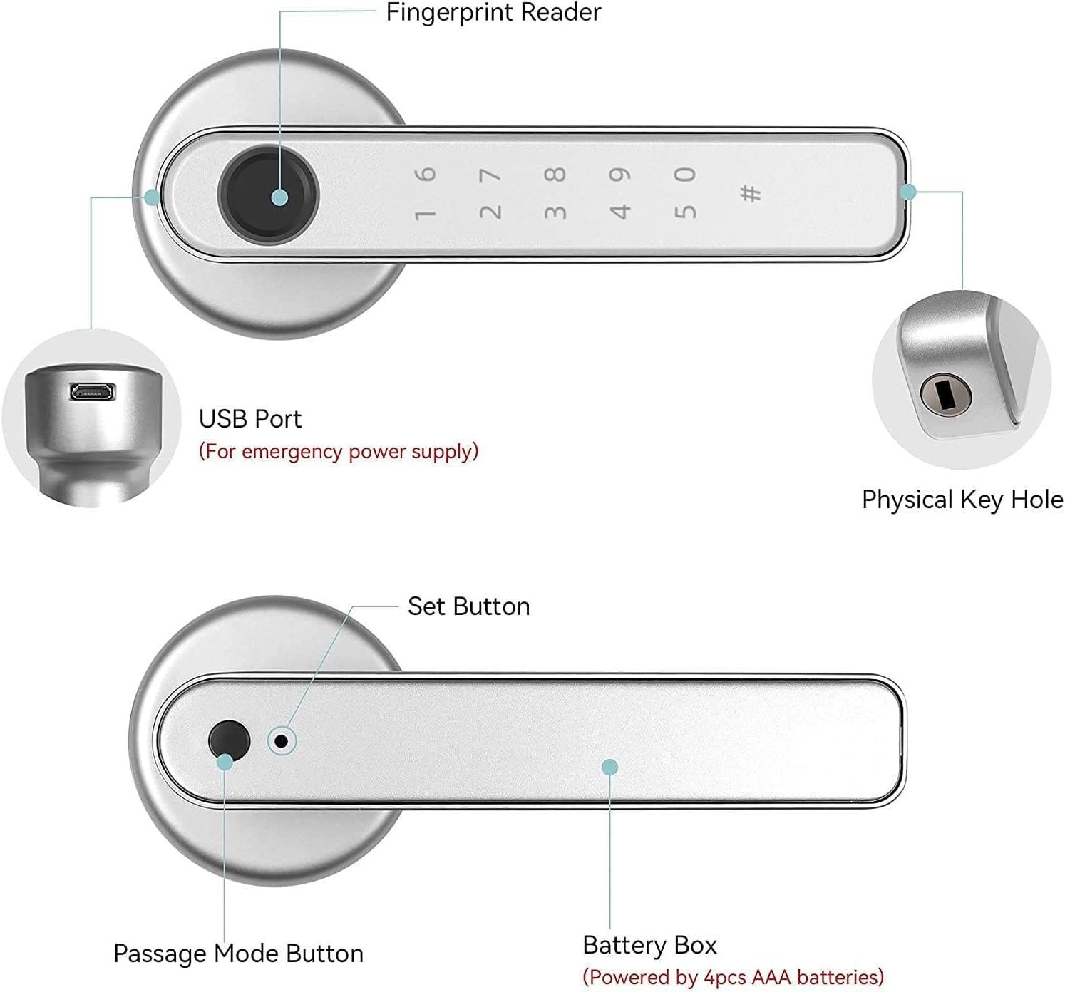 🔐【Humanized design】Max 100 group fingerprints, Low battery alert with red LED 5times flash, USB emergency power port (USB cable included),adjustable door handle for left or right door, auto-lock and normal-open modes ,making your locks more secure and private
