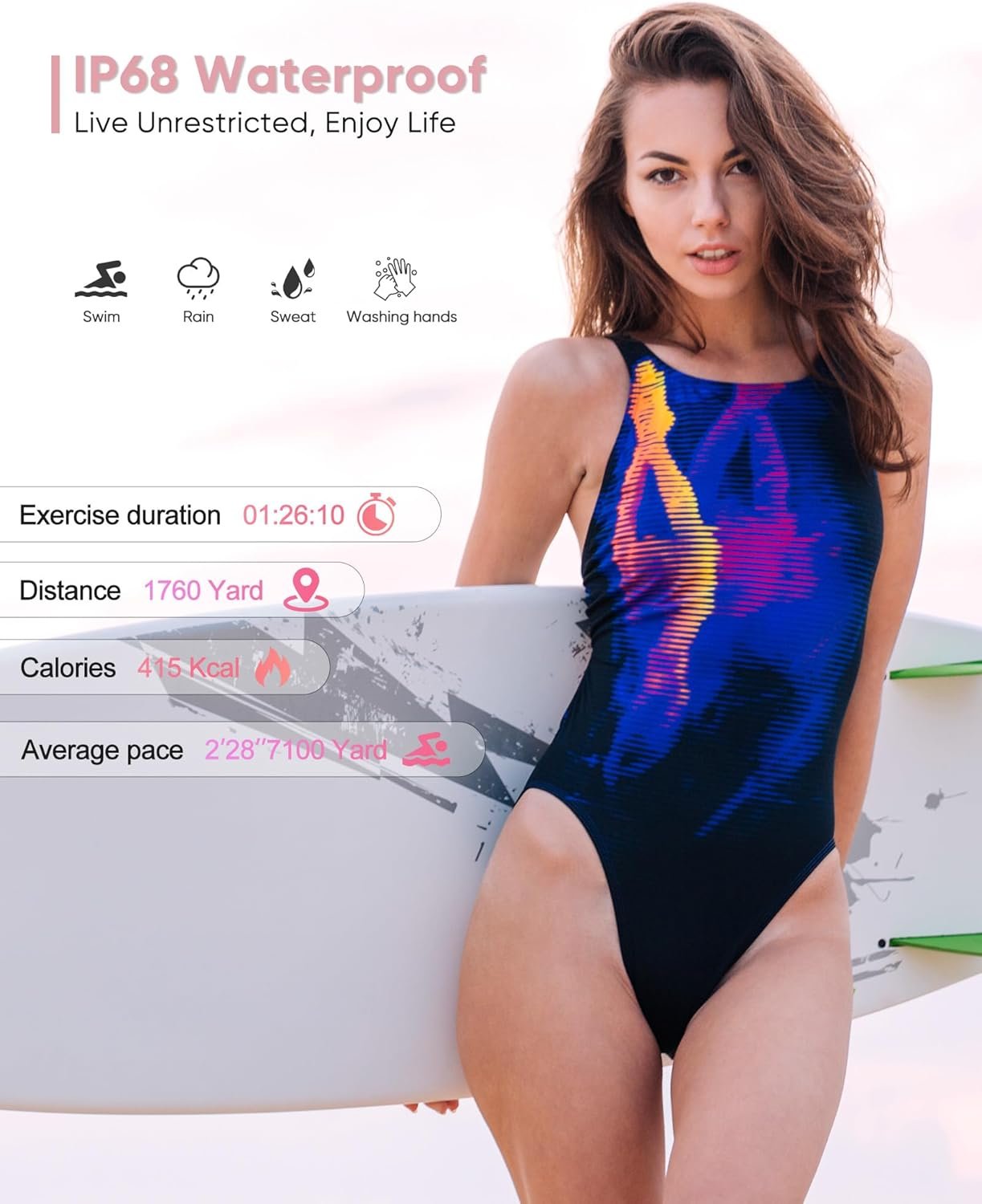 💎【1.47″Touch Screen & 200+Dials】This 1.47-inch fitness tracker has an ultra-high-definition color touch screen made of TFT material, which has higher color saturation, clearer pictures, and smoother operation. [GloryFit] There are more than 200 different styles of watch faces for you to choose from, and you can upload pictures to customize your own watch faces.