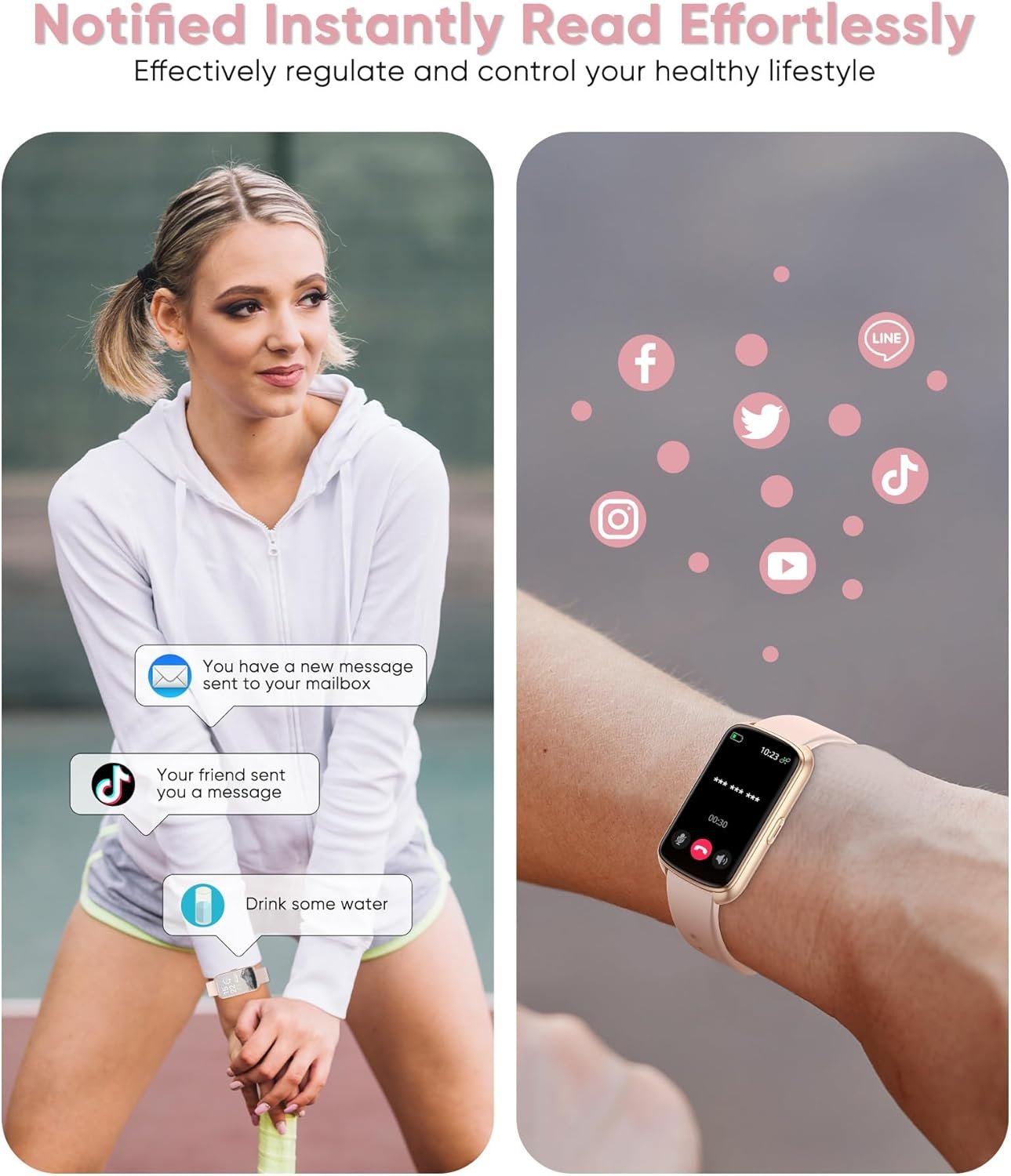 Supports Multiple Applications:This smart bracelet has call reminders, SMS notifications, and supports message reminders from 29 social software such as Tiktok, Facebook, Instagram, WhatsApp, etc. It has a wide compatibility.