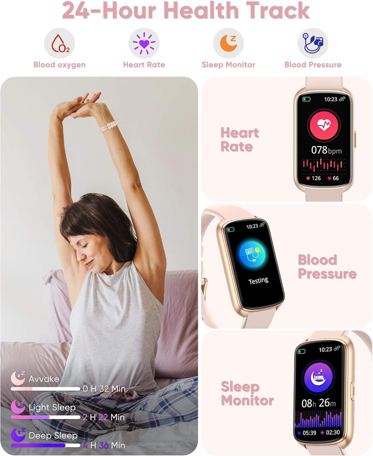 💖【Health Monitoring & Smart Reminder】This activity trackers can measure your heart rate, blood oxygen and blood pressure in real time for 24 hours, Its sleep tracker function can continuously record and analyze your sleep quality and provide analysis reports to help you adjust your sleep habits. It also has functions such as weather forecast, water drinking reminder, sedentary reminder and female menstrual management, which can intelligently help you adjust your lifestyle and travel.