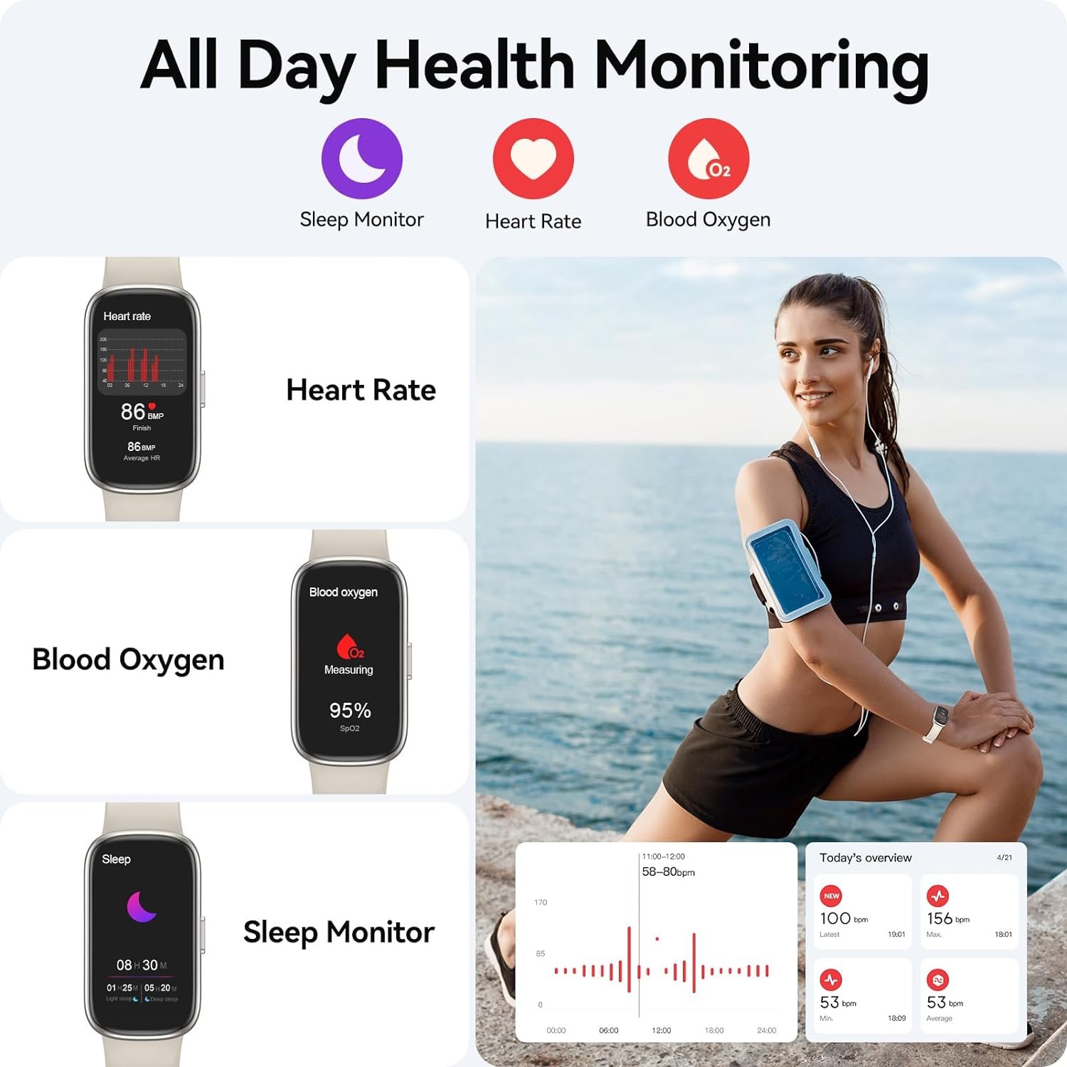 【Comprehensive Sleep Monitoring and Analysis】Equipped with a high-precision sleep monitoring sensor, this sleep tracker can monitor sleep quality accurately, including deep sleep, light sleep, awake periods, effectively helping you improve your sleeping habits, improve sleep quality, and have an energetic day.