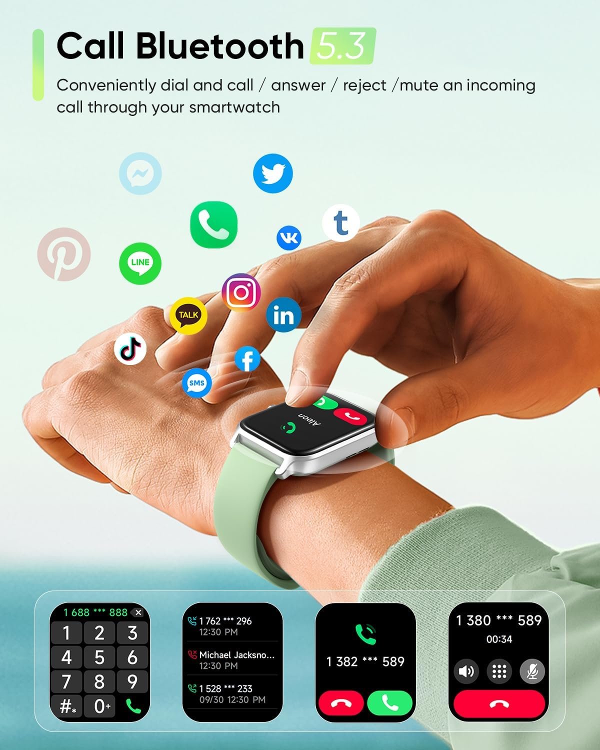 【Alexa Voice Control & Bluetooth Calling】Work with Amazon Alexa, you can ask questions, control music playback, check the weather, set alarms and timers, and more by speaking to your watch. With Bluetooth 5.3, you can also answer/make clear calls directly from your smart watches when your phone is out of reach. (THE WATCH CAN NOT SEND MESSAGES, or TEXT BACK, Bluetooth distance 8-10 meters).