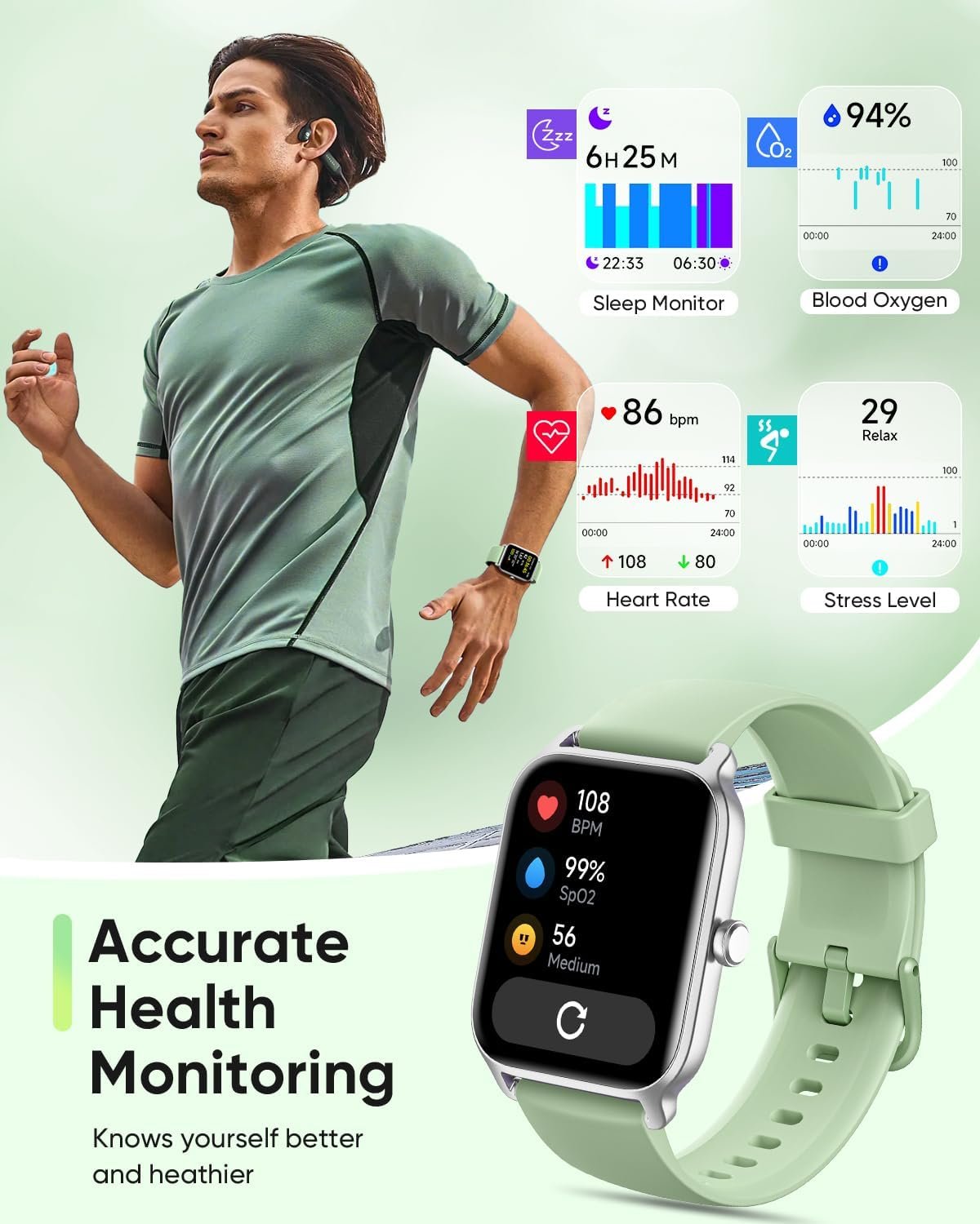 【24/7 Accurate Health Monitoring】This fitness watch will continously records your daily steps, distance, calorie consumption. Also it features advanced sensors to monitor heart rate, blood oxygen levels, stress levels & sleep tracking. All recorded data can be synced to your phone for analysis, providing valuable insights into your health and facilitating lifestyle adjustments.