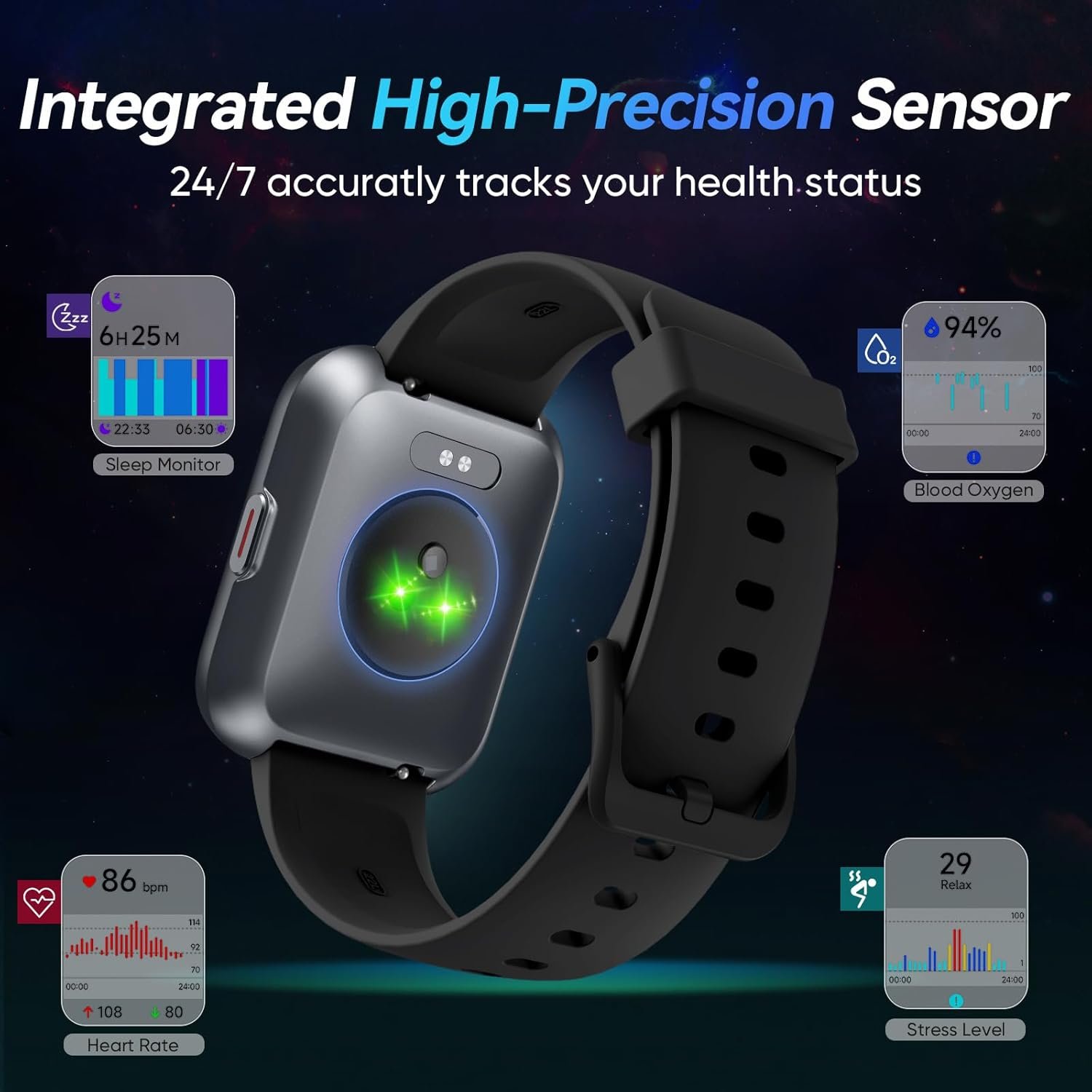 【24/7 Health Monitoring】Automatically count your daily steps, distance, and calorie consumption. Advanced sensors monitor heart rate, blood oxygen levels, stress, and sleep patterns. Sync all recorded data to the “Veryfit” app for insightful health analysis, empowering you to make informed lifestyle adjustments.