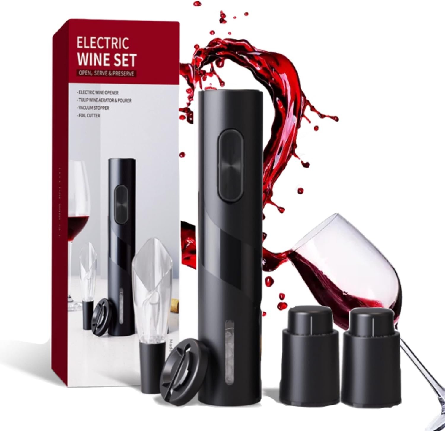 Five-Piece Electric Wine Opener Set,Battery Powered Automatic wine bottle opener with Foil Cutter, two Wine Stoppers and Pourer for wine lovers Gift, Kitchen Bar Party Outdoor Wedding helper