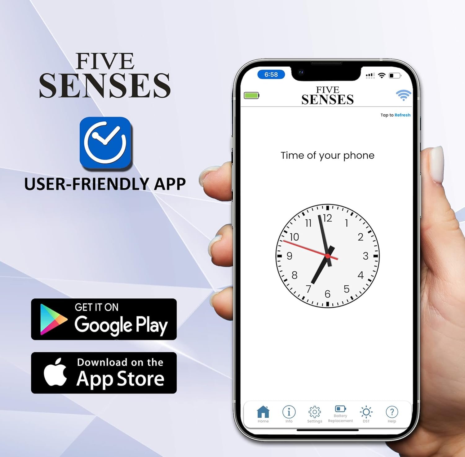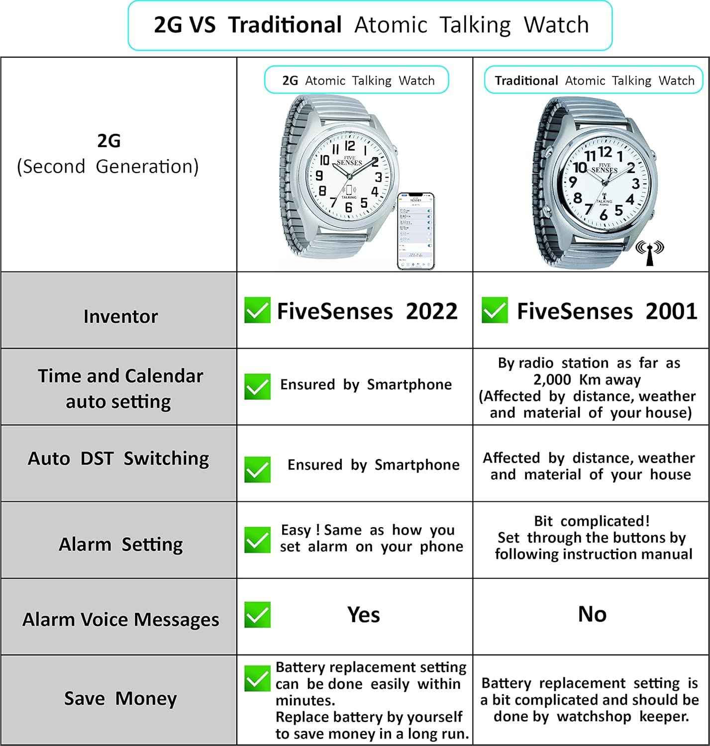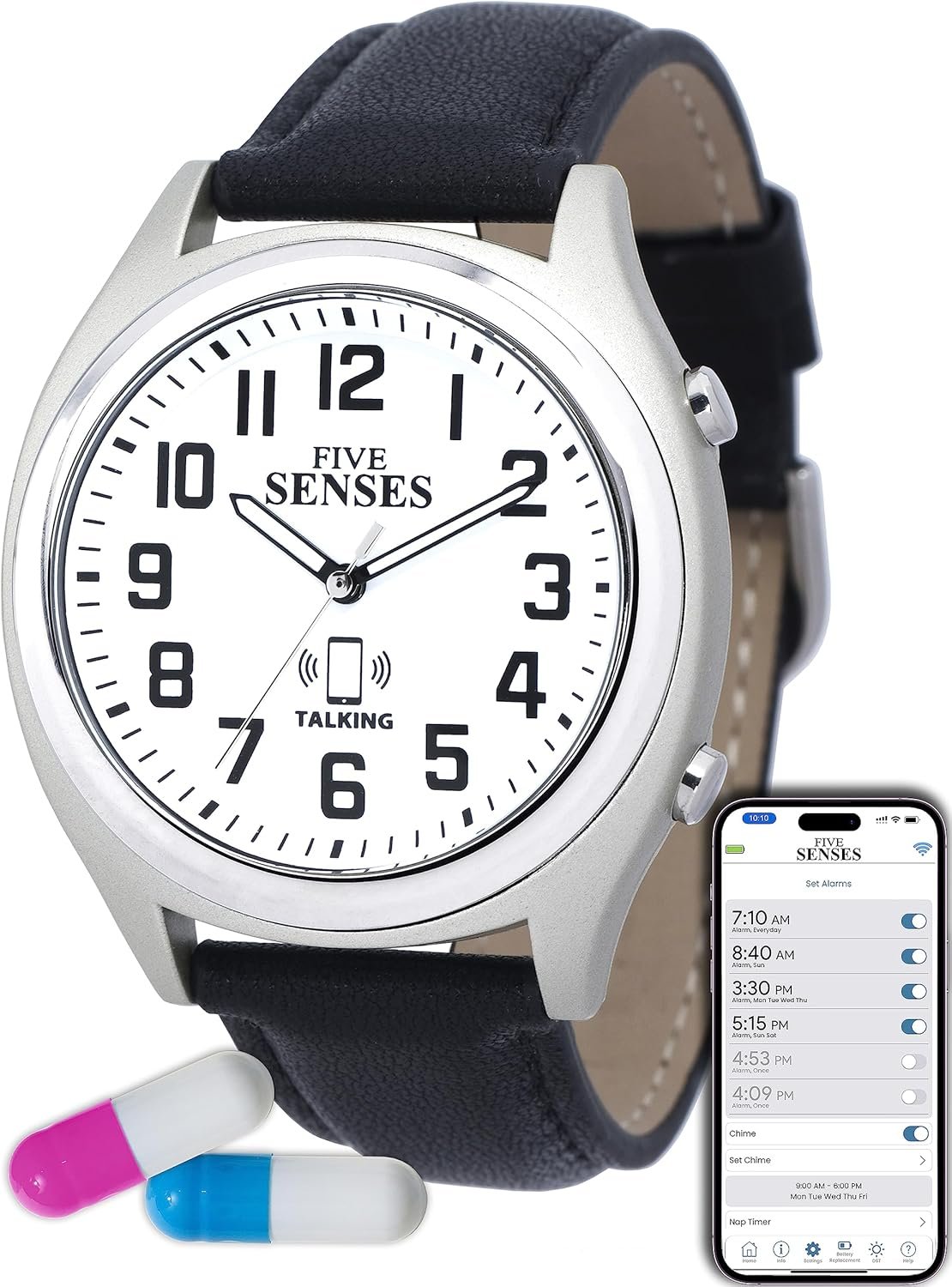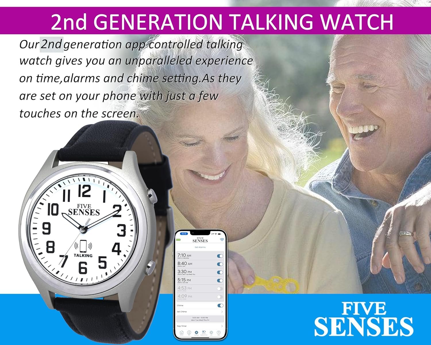 The 2nd generation of Atomic Talking Watches is here and ready for you to enjoy their benefits and user-friendly advantages! The Five Senses app-controlled on your cellphone talking watch provides an unparalleled user-friendly experience of quick and simple settings to assist the elderly, visually impaired, or seniors with memory loss to help keep them on the time track.