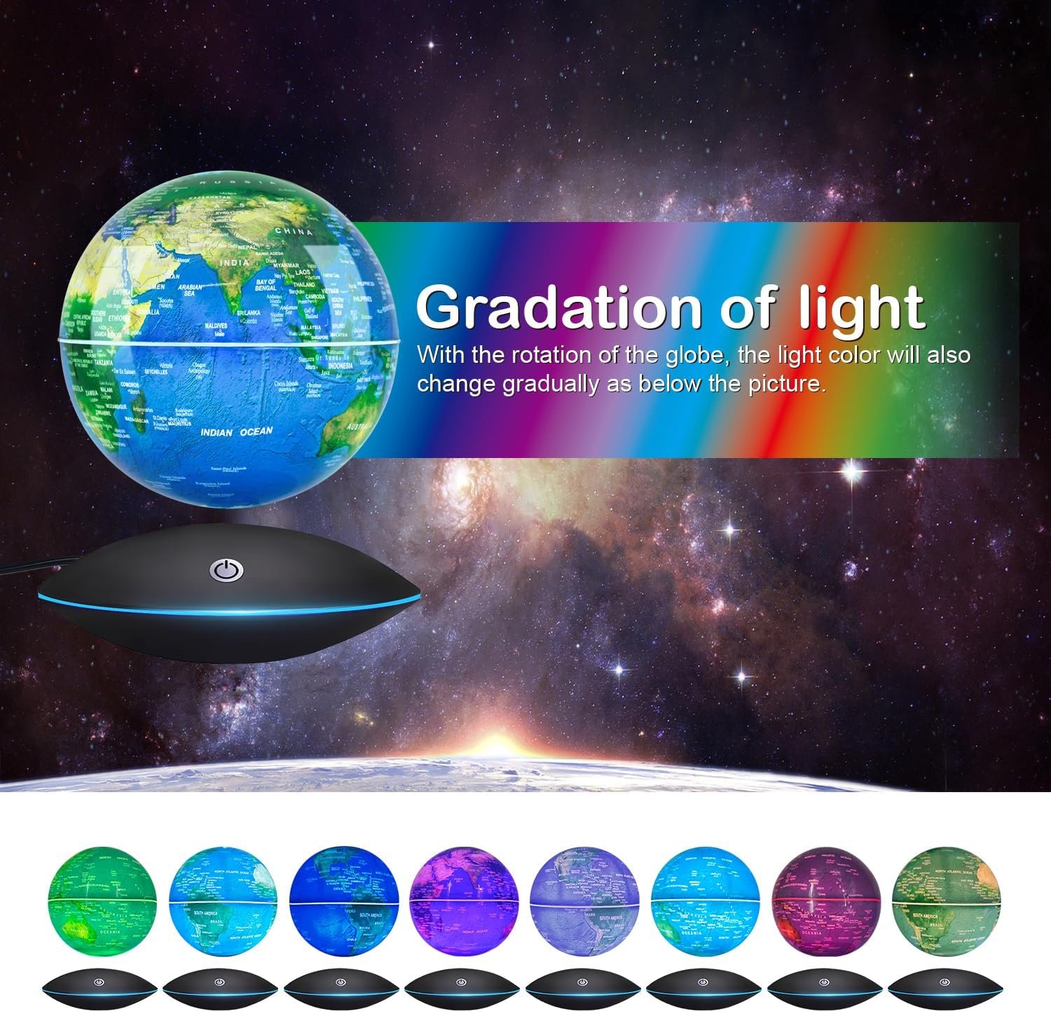 ILLUMINATION: Both the sphere and the base could be illuminated. As lights are mild, this cool gadget could be used as a night light which looks wonderful in the dark. The floating globe is also a perfect elegant decoration for spaces like at home, office, school, shop, or meeting room.